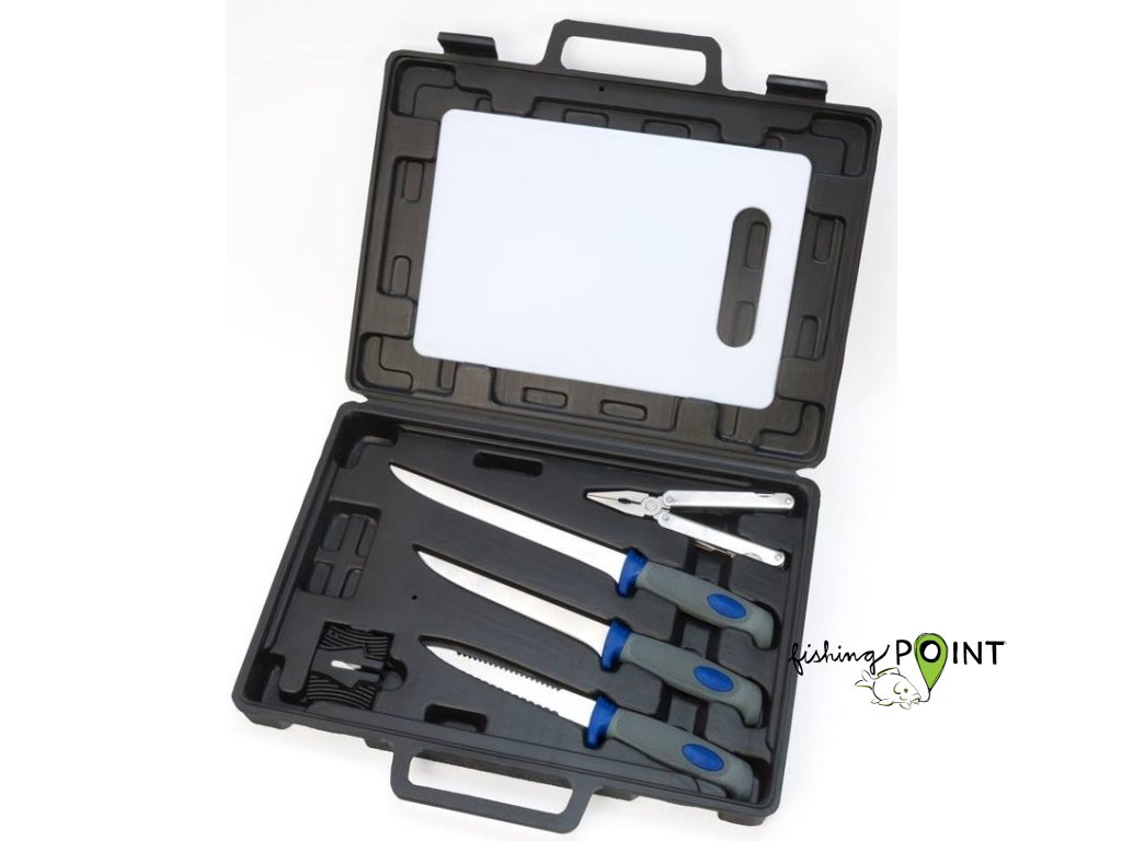 Sada v praktickém plastovém kufříku obsahuje: - 3x nůž z nerezové oceli a střenkami z ABS materiálu (25cm/27cm/32cm) - 1x brousek - 1x multifunkční kleště (16cm) - 1x plastové prkénko (28,5cmx19,5cm)Doplňkové parametry
