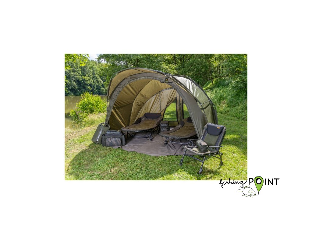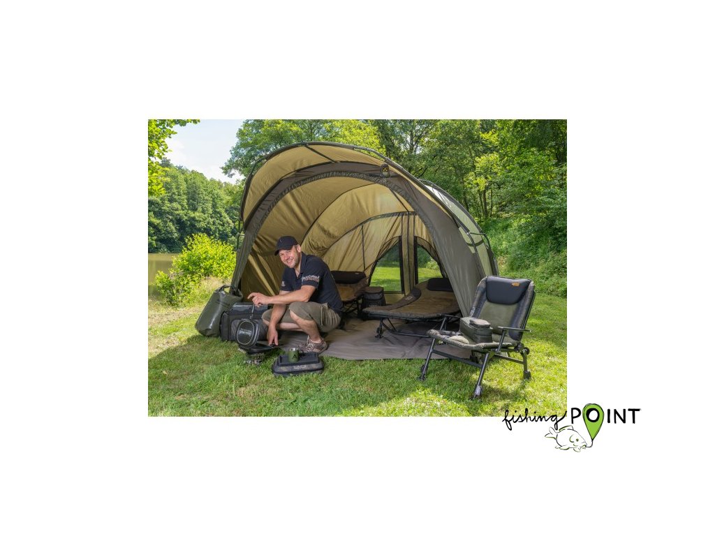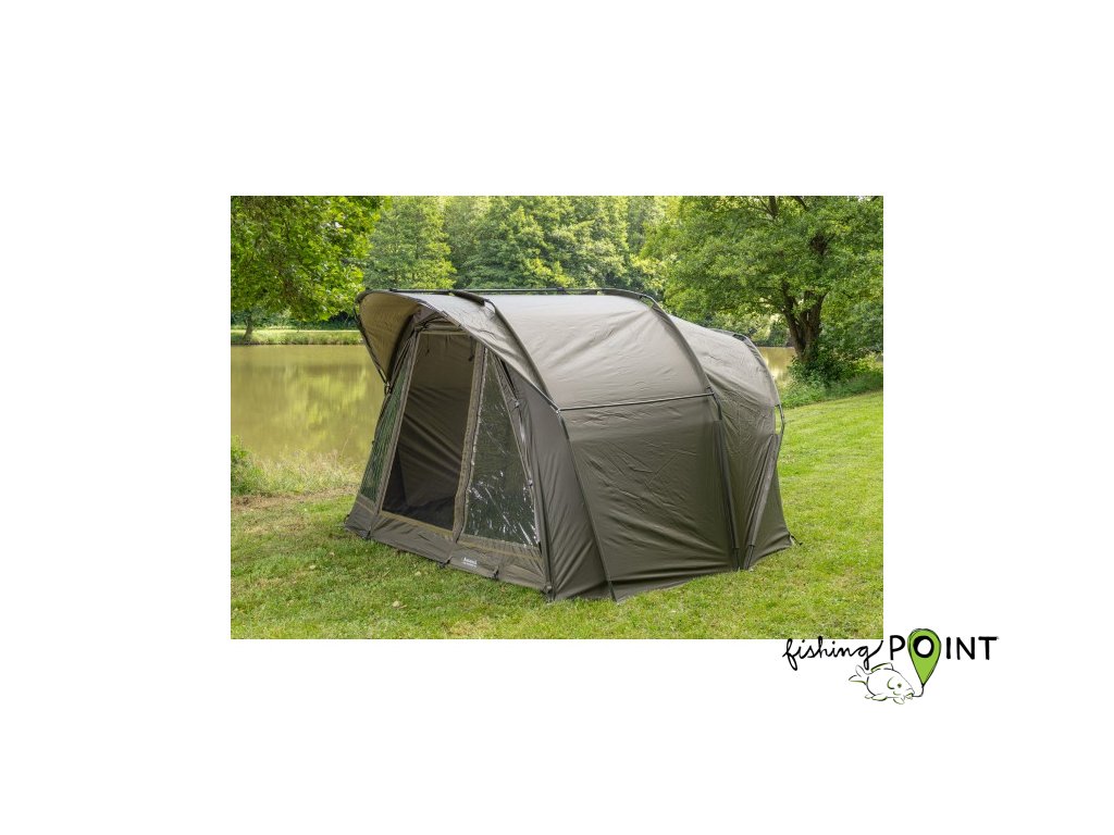 Pokud jde o stabilitu a prostornost, je tento bivak těžké porazit. Díky výšce 190 cm můžete stát v bivaku ve vzpřímené poloze a máte zde dostatek místa pro umístění dvou velkých rybářských lehátek. Abychom získali dokonalou statiku, jsou na obou stranách podpěrné tyče. Velký kšilt zabraňuje vnikání dešťové vody vstupním prostorem. Bivak je dodáván bez zimního přehozu, který je možno dokoupit.rozměry: 300 x 320 x 190 cm