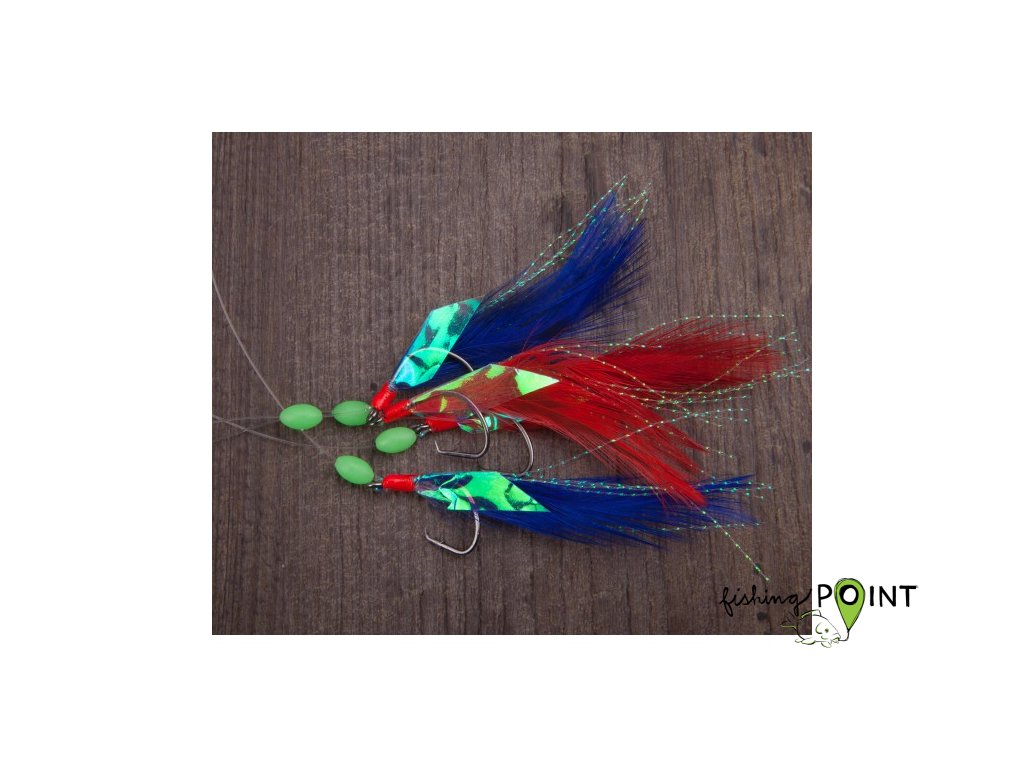 Systém pro lov makrel s třemi háčky. Nad háčkem jsou fluoro korálky a na háčku fluorescenční folie s barevnými střapci. délka návazce 125 cm kmenový vlasec 0,60 mm velikost háčků 1/0Doplňkové parametry