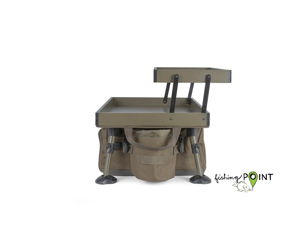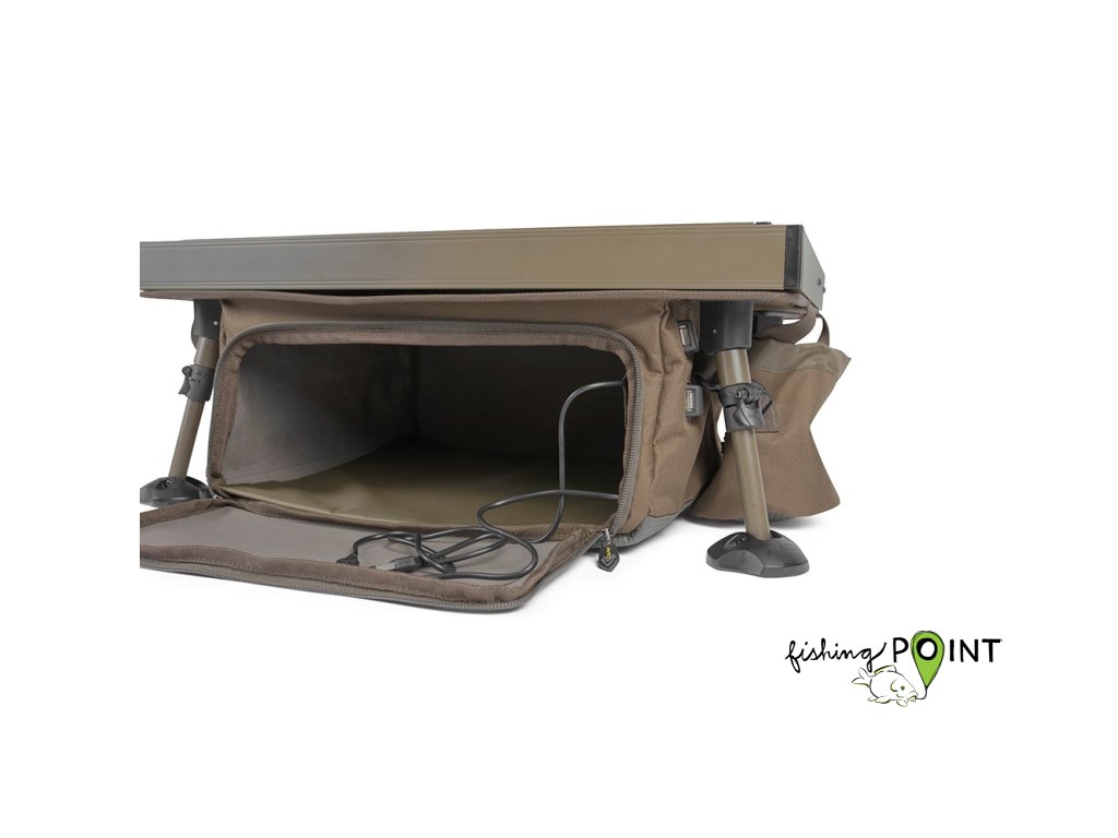 Organizér má plně nastavitelné LokDown nohy, což jej umožňuje postavit do ideální roviny i na svažitém břehu. Na horním patře je na zadním okraji integrovaný držák na tablet nebo mobilní telefon, který vám umožní sledovat tato zařízení v tom správném úhlu. Organizér je snadno složitelný do kompaktní velikosti, aby jej bylo jednoduché přepravovat na vozíku i v autě.