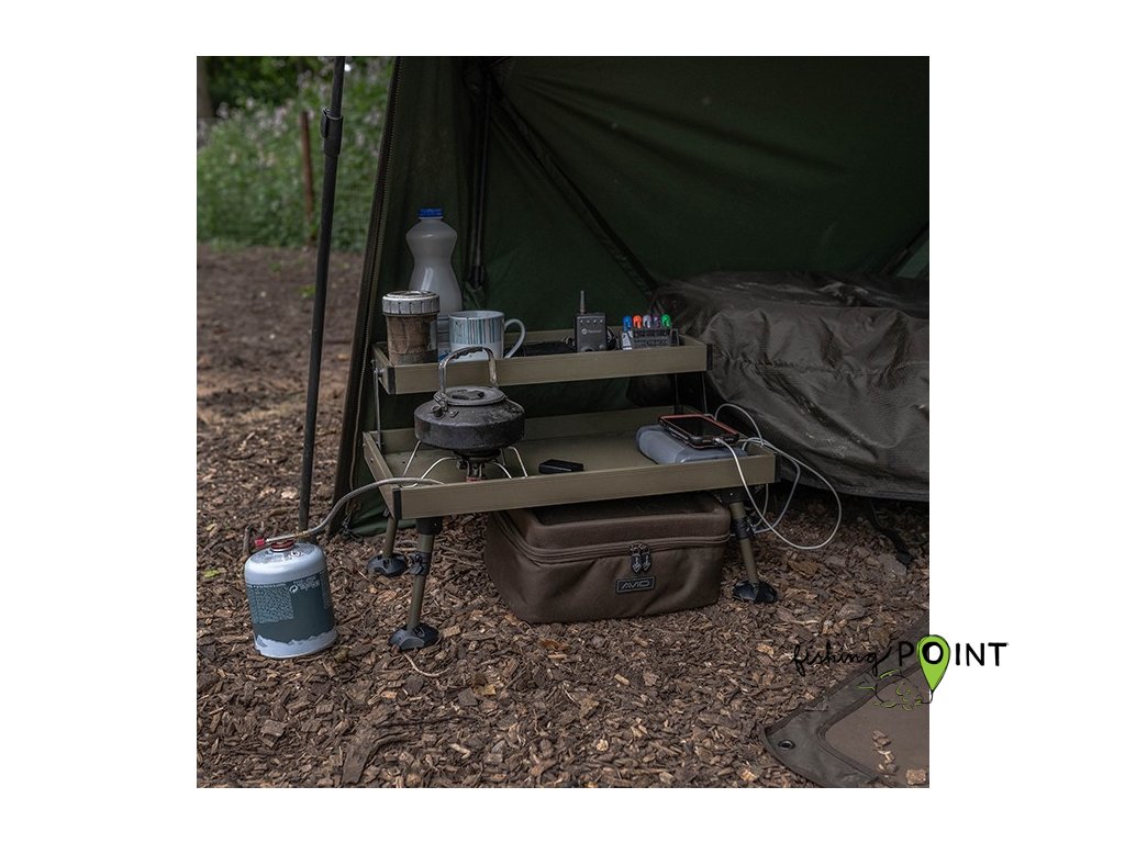 Double Decker Bivvy table je první bivvy stolek s touto unikátní konstrukcí na trhu. Jak je z názvu patrné tak má stolek dvě patra, která tak pojmou více vašeho vybavení. Mějte např. své cennosti oddělené od rybářského vybavení. Cennější věci je dobré uschovat na horní patro stolku, kde budou více chráněny před poškozením a na ostatní rybářské vybavení stále zbude dostatek místa v dolním patře. Na horním patře je na zadním okraji integrovaný držák na tablet nebo mobilní telefon, který vám umožní sledovat tato zařízení v tom správném úhlu.