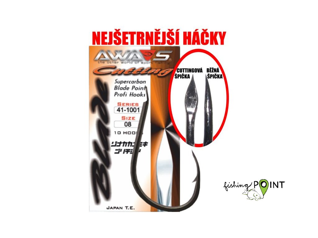 Háček s lopatkou, s cutting broušeným hrotem a s protihrotem pro všechny druhy lovu. Rybářské háčky s lopatkou. AWA-SHIMA háčky Cutting Blade 1001 - jsou výsledkem mnohaletých studií a zkoušek.AWA SHIMA laboratoře vyvinuly jedinečný nerezavějící karbon, který má vynikající vlastnosti pro ostření a jemný průnik rybí tlamou. Dále vykazuje vynikající odolnost proti opotřebení a zničení.