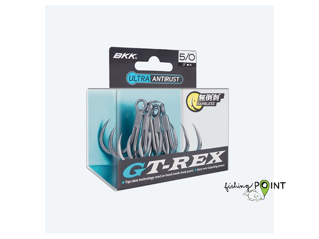 Trojháček BKK GT-REX byl původně vyvinut na chytání obrovských tuňáků a kranasů. Má Hand Ground hrot háčku a unikátní BKK potažení háčku Ultra-Antirust Coating, což zaručuje, že drží ostrost a výborně proniká do tlamy dravce. Všechny detaily GT-REX trojháčku od očka po hrot byly navrženy tak, že byl vytvořen nejlepší háček nejenom na popování v teplých mořích. GT-REX obdržel cenu Good Design Award 2019.Doplňkové parametry