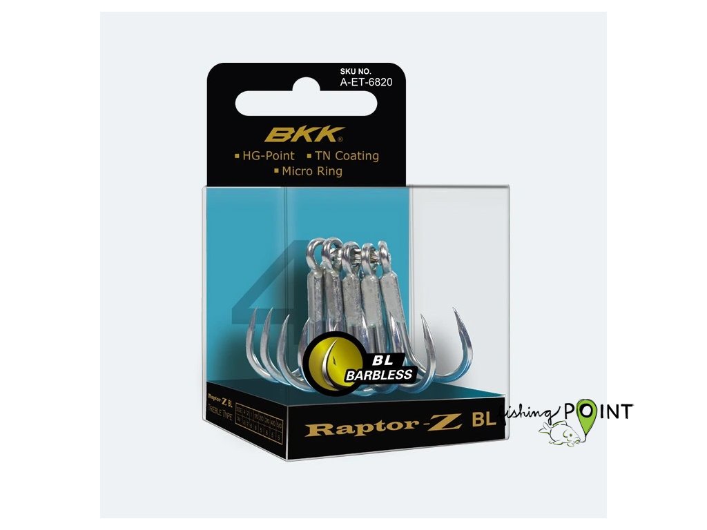 Na háček Raptor-Z byly použity nejnovější BKK výrobní technologie. Byl vyroben tak, aby zahákl a zdolal silné a agresivní rybí monstra. Díky BKK Hand ground technologii a Ultra-Antirust potažení je vybaven ultimátní sílou při záseku. Pronikne i do těch nejtvrdších rybích čelistí a má mimořádnou odolnost vůči korozi. BKK Slim Ring technologie umožňuje jednodušší navléknutí na kroužek. Je to jeden z nejpoužívanějších trojháčků s širokou škálou uplatnění.Doplňkové parametry