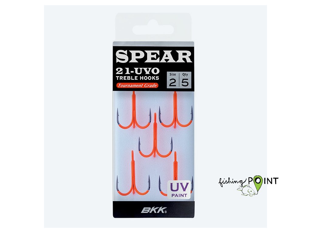 BKK háček Spear 21 UVO byl navržen pro chytání v hluboké sladké vodě nebo za zhoršených světelných podmínek či v kalné vodě. Díky těmto háčkům dravci lépe objeví vaši nástrahu. BKK ultra fialová oranžová (UVO) barva na háčku je vysoce kontrastní a svítí, pokud je ve vodě přítomno UV světlo. UV světlo proniká do mnohem větší hloubky než světlo, které vnímáme našim okem. Háčky mají oválná ramínka a jemný drát díky čemuž pronikají do rybí tkáně hluboko a s malým vynaložením síly. Přesně kované ramínko háčku zvyšuje jeho sílu o 20%, což vede k mnohem vyšší životnosti háčku. Přiměřená délka ramínka háčku mu otevírá možnosti použití na mnoha nástrahách jako jsou gumy, povrchovky, woblery a další tvrdé nástrahy.Doplňkové parametry