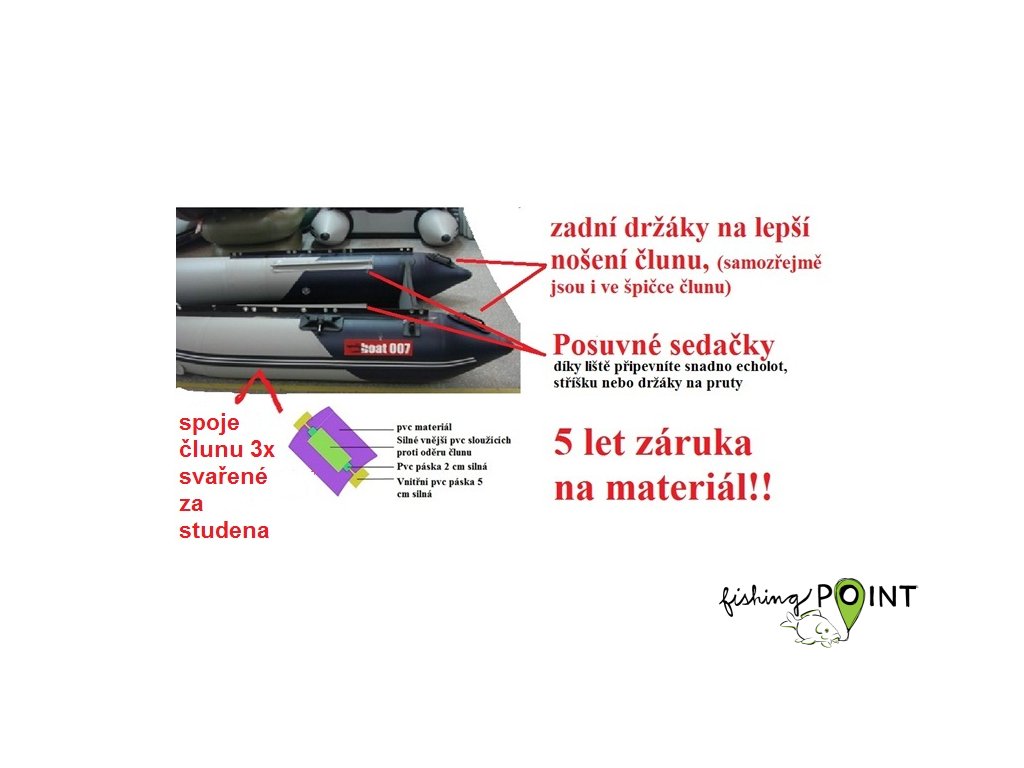 PVC materiál je několikavrstvý o síle 1100g/m2 a je na něj 5 let záruka. Spoje člunů jsou svařované za studena, kde stroj dávkuje lepidlo a následně ho stlačí, tím se eliminuje faktor lidské chyby při ručním lepení spojů. Navíc naše spoje jsou ze 4 vrstvev materiálu (viz.obrázek) s použitím velmi kvalitního francouzského lepidla, díky tomu je na spoje 3 letá záruka.