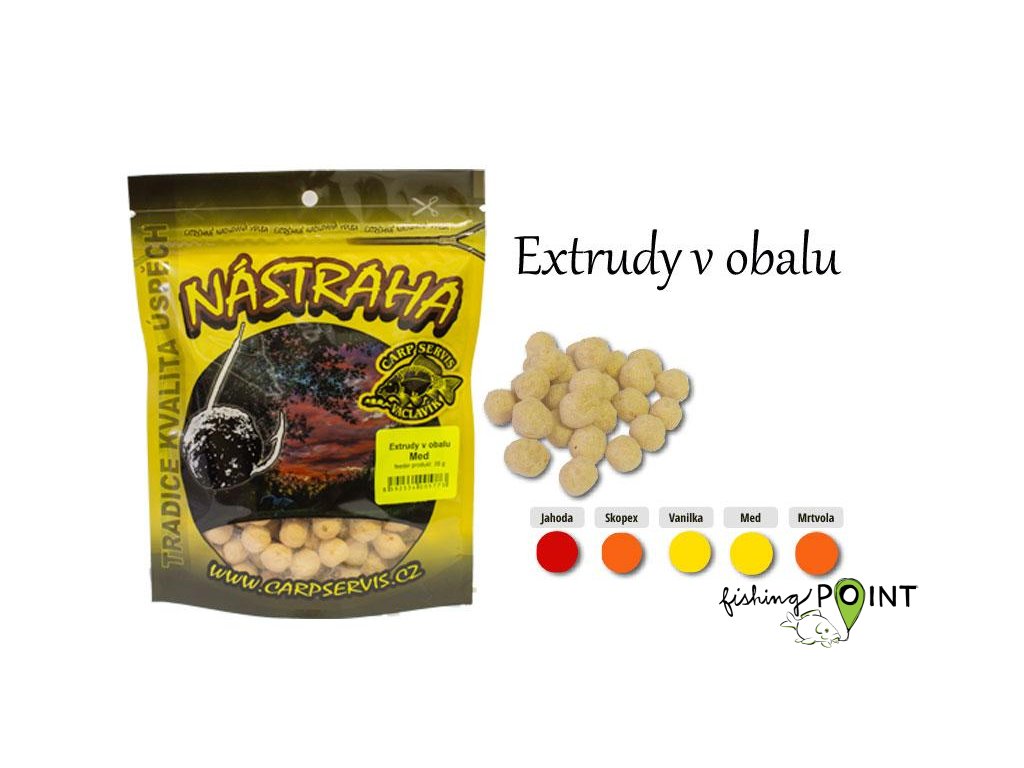 Extrudy v obalu jsou speciální měkkou nástrahou s prodlouženou trvanlivostí nastražení. Po vhození do vody se náhle projasní a zesílí jejich barva, která se pak stává jedním z důležitých aspektů rybolovné úspěšnosti. Atrakční impulzy tato nástraha vydává díky použitým enzymaticky upraveným živočišným bílkovinám, velice intenzivně a dlouho. Extrudy v obalu jsou určeny pro celoroční rybolov.