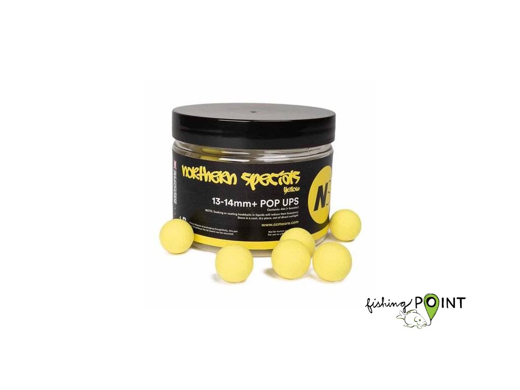 Plovoucí boilie Northern Specials (Speciály ze severu Anglie) jsou vyráběny dle receptury anglického profi kapraře Gaze Farehama, který ji spolu se svými kamarády roky vypiplával k dokonalosti. Nyní jsou k dostání jako speciální řada pop-upů od CC Moore, s kterou Gaz úzce spolupracoval. NS1+ v průměru 14 mm (35 ks), v barvách bílá, žlutá a růžová jsou vylepšenou variantou původních NS1. Jsou výraznější, více plavou a hodí se dobře na lov ve sloupci a způsobem Zig-rig nebo Chod-rig. K ještě výraznějšímu zesílení vůně a účinnosti boilie je v kelímku přiložený tekutý aktivátor, jehož obsah po otevření krabičky vylijte na kuličky a nechte vsáknout. Nemusíte mít strach, že by došlo ke zkažení.Doplňkové parametry