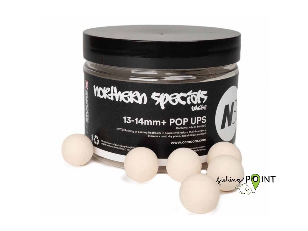 Plovoucí boilie Northern Specials (Speciály ze severu Anglie) jsou vyráběny dle receptury anglického profi kapraře Gaze Farehama, který ji spolu se svými kamarády roky vypiplával k dokonalosti. Nyní jsou k dostání jako speciální řada pop-upů od CC Moore, s kterou Gaz úzce spolupracoval. NS1+ v průměru 14 mm (35 ks), v barvách bílá, žlutá a růžová jsou vylepšenou variantou původních NS1. Jsou výraznější, více plavou a hodí se dobře na lov ve sloupci a způsobem Zig-rig nebo Chod-rig. K ještě výraznějšímu zesílení vůně a účinnosti boilie je v kelímku přiložený tekutý aktivátor, jehož obsah po otevření krabičky vylijte na kuličky a nechte vsáknout. Nemusíte mít strach, že by došlo ke zkažení.Doplňkové parametry