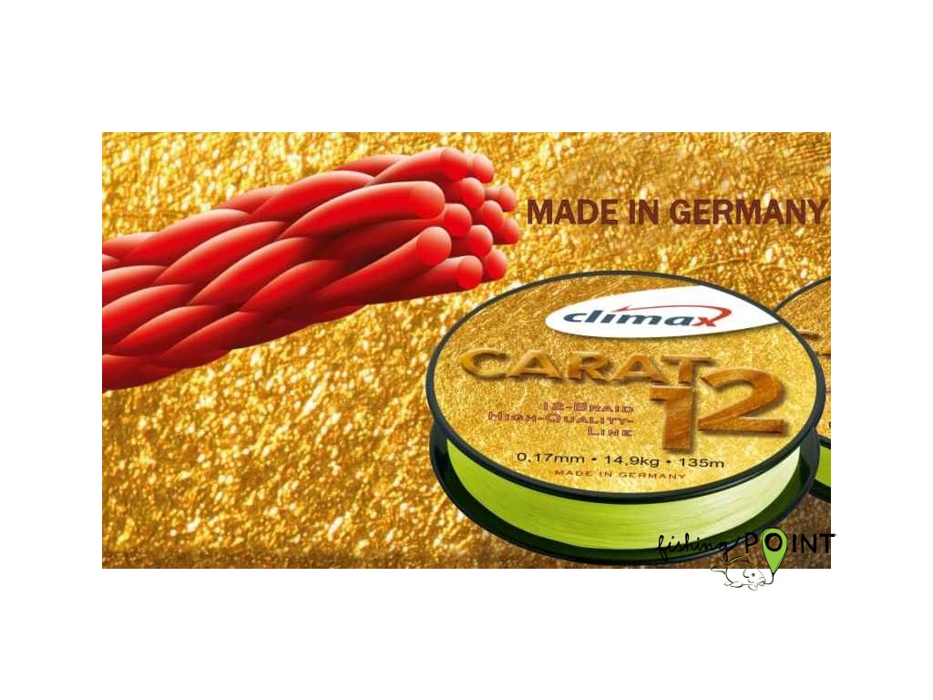Pletená šňůra pro profesionály s nejjemnějším povrchem. Nejlepší kvalita pro nejlepší rybáře s certifikátem - nejlepší šňůra roku !. Extrémně pevnost s obrovskou trvanlivostí, odolnost proti oděru a ochrana před infiltrací špíny a UV záření.Nejlepší šňůra na světě Carat 12 od Climax-u! Tuto pletenou šňůru ohodnotili na prestižním světovém veletrhu China Fish jako Nejlepší nový produkt roku 2017. Německý Climax se tak stal díky revolučnímu spirálovému designu šňůry Carat 12 prvním evropským výrobcem, který získal takové ocenění.
