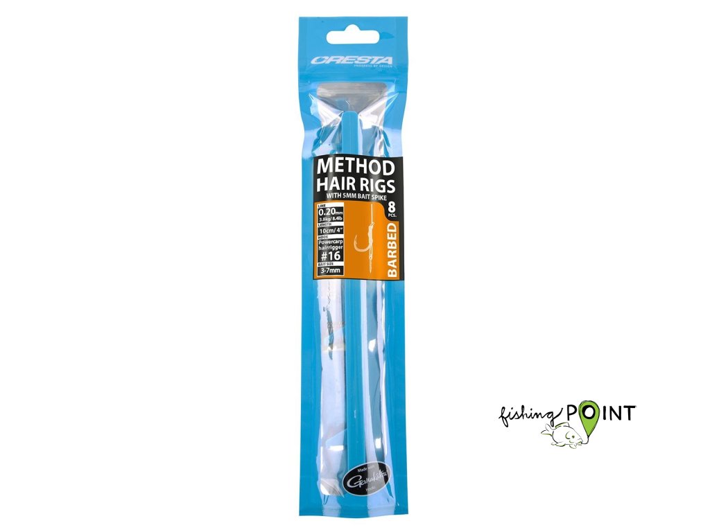 Tyto CRESTA Method návazce jsou vyrobeny z vysoce kvalitních komponentů a mají originál GAMAKATSU POWER CARP Hairrigger LIGhT háček. Dobře vyvážený průměr vlasce a velikosti háčků ve spojení s 10 cm délky návzce, který je osazeny zapichovacím trnem, činí tyto návazce velmi vhodnými pro method feederový rybolov na kaprovité ryby. Napíchnutím nástrahy na trn (dumbles, boilies, kukuřice atp.) zůstává háček kompletně volný a zvyšuje se šance na dokonalý záběr a zásek. Díky zdarma dodávané CRESTA skladovací jednotce lze těchto 8 návazců pohodlně skladovat a mohou být vloženy přímo do CRESTA modulárního boxu na návazce.Typ háčku: GAMAKATSU Powercarp Hair Rigger (s protihrotem )