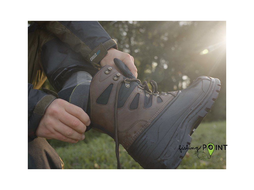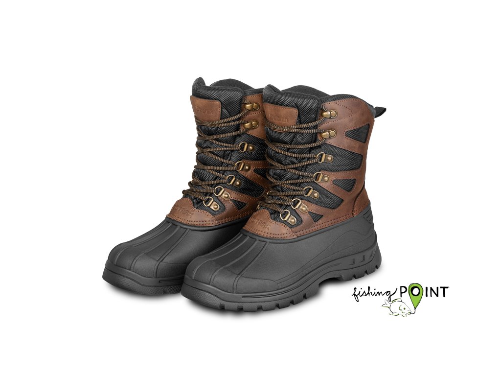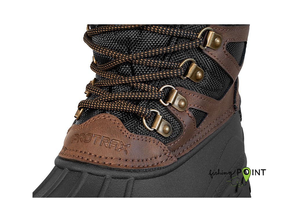 Během zimních měsíců je komfort u vody prioritou, právě proto jsme se rozhodli rozšířit zimní sortiment o obuv, která ochrání vaše nohy před chladem i vlhkostí. Vysoké boty Delphin ProTRAX jsou ideální volbou do nevyzpytatelných zimních podmínek, kdy se potřebujete spolehnout na každý krok. Při vývoji byly použity materiály s důrazem na maximální pohodlí. Spodní část je vyrobena z termoplastické gumy, což zaručuje nízkou hmotnost a dlouhou životnost bot. Zvýšený gumový lem sahá až pod kotníky a spolehlivě chrání vaše nohy před vlhkostí při chůzi přes louže, roztátý sníh či bláto. Gumová podrážka se navíc velmi snadno čistí a její protiskluzový vzor poskytuje stabilitu i na kluzkých površích. Vrchní část boty je vyhotovena z kombinace umělé kůže a síťoviny, která udrží vaše nohy v teple i při velmi nízkých teplotách. Ke zvýšení odolnosti vůči chladu přispívá kombinace fleecového materiálu a jemné umělé kožešiny uvnitř boty. Spojení těchto vlastností zajišťuje pohodlí i při vycházkách v extrémním počasí, například při lovu na dírkách, kde bota přichází do přímého kontaktu s ledem. Pohodlné nošení zajišťují kvalitní šňůrky provlečené přes kovová oka. Pro dokonalé zafixování nohou se ve vrchní části po stranách nacházejí čtyři kovové šněrovací háčky. Výška boty je navržena tak, aby poskytovala odolnost i při vydatné sněhové nadílce. Vrchní lem usnadňuje obouvání a umožňuje jej provést rychle a pohodlně. Hnědo-černé barevné provedení dokonale ladí nejen s rybářskými outfity, ale výborně se hodí i k mysliveckému či ostatnímu outdoorovému oblečení. Pokud chcete spolehlivou obuv, která spojuje teplo, pohodlí a odolnost i v extrémních podmínkách, Delphin ProTRAX jsou tou správnou volbou.Doplňkové parametry