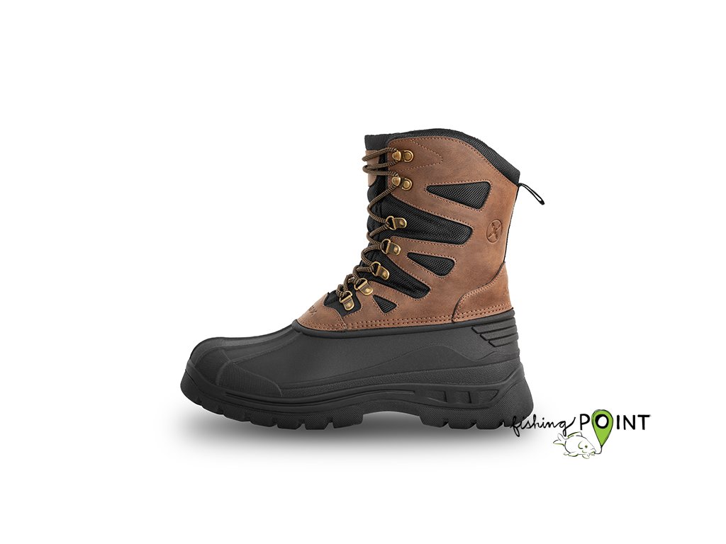 Během zimních měsíců je komfort u vody prioritou, právě proto jsme se rozhodli rozšířit zimní sortiment o obuv, která ochrání vaše nohy před chladem i vlhkostí. Vysoké boty Delphin ProTRAX jsou ideální volbou do nevyzpytatelných zimních podmínek, kdy se potřebujete spolehnout na každý krok. Při vývoji byly použity materiály s důrazem na maximální pohodlí. Spodní část je vyrobena z termoplastické gumy, což zaručuje nízkou hmotnost a dlouhou životnost bot. Zvýšený gumový lem sahá až pod kotníky a spolehlivě chrání vaše nohy před vlhkostí při chůzi přes louže, roztátý sníh či bláto. Gumová podrážka se navíc velmi snadno čistí a její protiskluzový vzor poskytuje stabilitu i na kluzkých površích. Vrchní část boty je vyhotovena z kombinace umělé kůže a síťoviny, která udrží vaše nohy v teple i při velmi nízkých teplotách. Ke zvýšení odolnosti vůči chladu přispívá kombinace fleecového materiálu a jemné umělé kožešiny uvnitř boty. Spojení těchto vlastností zajišťuje pohodlí i při vycházkách v extrémním počasí, například při lovu na dírkách, kde bota přichází do přímého kontaktu s ledem. Pohodlné nošení zajišťují kvalitní šňůrky provlečené přes kovová oka. Pro dokonalé zafixování nohou se ve vrchní části po stranách nacházejí čtyři kovové šněrovací háčky. Výška boty je navržena tak, aby poskytovala odolnost i při vydatné sněhové nadílce. Vrchní lem usnadňuje obouvání a umožňuje jej provést rychle a pohodlně. Hnědo-černé barevné provedení dokonale ladí nejen s rybářskými outfity, ale výborně se hodí i k mysliveckému či ostatnímu outdoorovému oblečení. Pokud chcete spolehlivou obuv, která spojuje teplo, pohodlí a odolnost i v extrémních podmínkách, Delphin ProTRAX jsou tou správnou volbou.Doplňkové parametry