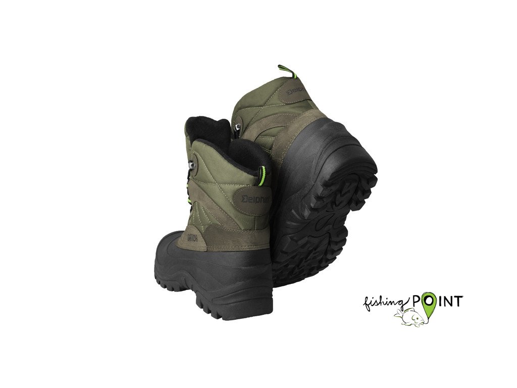 Boty Delphin GATOR jsou určeny na extrémní výpravy zejména v chladnějších obdobích roku. Zvýšený gumový lem podrážky sahá až do výšky kotníků, to znamená, že chůze v loužích, rozbředlém sněhu a blátě není pro GATOR problém. Tato pryžová část se navíc velmi dobře čistí. V zadní části gumové části boty se nachází výstupek, díky kterému si botu bez problémů zujete. Svršek boty je tvořen kombinací odolné nylonové látky a umělé kůže. Tyto materiály dobře odolávají nepřízni počasí a jednoduše se v případě potřeby impregnují. Jazyk boty je přišitý až do výšky 17cm, to znamená, že krátkodobě se můžete pohybovat v takto hlubokých vlhkých oblastech. Šněrování je řešeno přes textilní očka, na vrchu šněrování se nachází jedno kovové oko. Vnitřek boty je tvořen příjemným mikrofleecovým materiálem. O tepelné pohodlí se postará vrstva umělého mikrovlákna mezi vnější a vnitřní vrstvou. Černo-zelenou kombinaci materiálů ocení nejen rybáři, ale i myslivci, turisté a všichni ostatní milovníci přírody. I přes svou mohutnost jsou boty velmi lehké, což jistě přijde vhod při dlouhodobější chůzi. Například obě boty velikosti 43 váží pouze 1200g.Doplňkové parametry