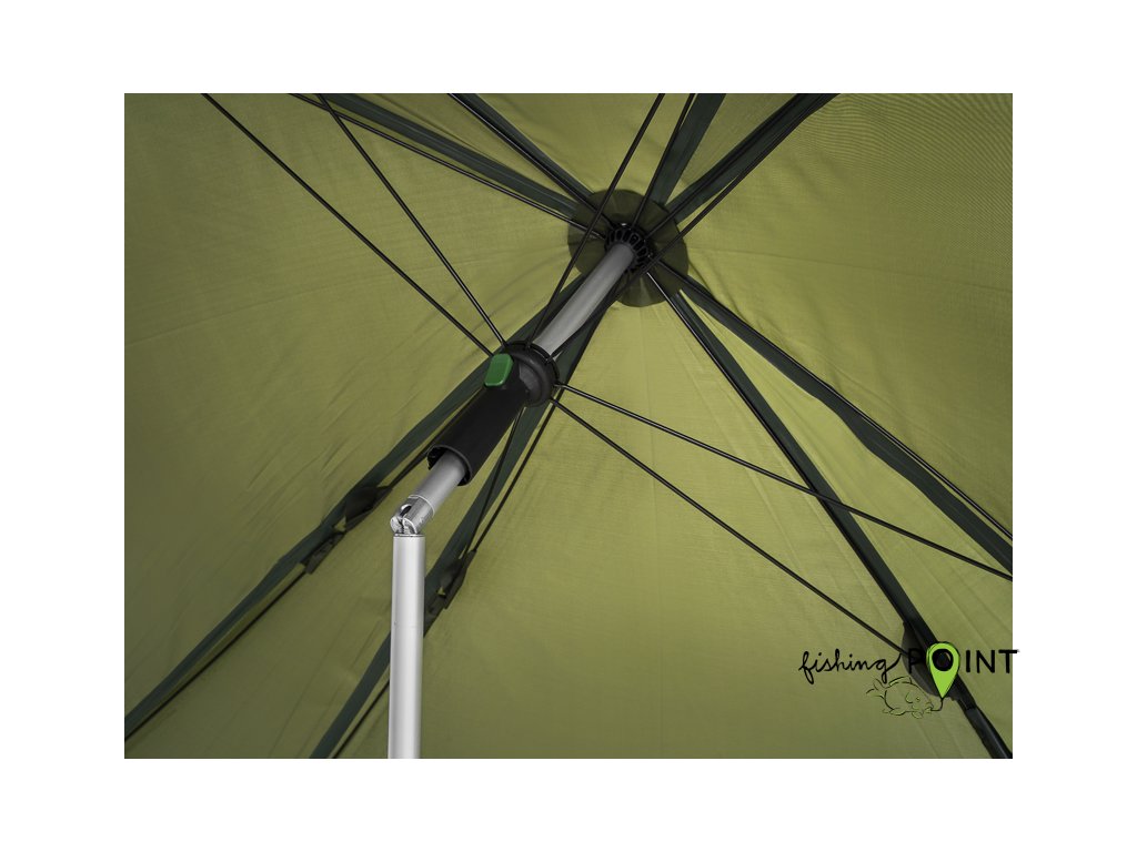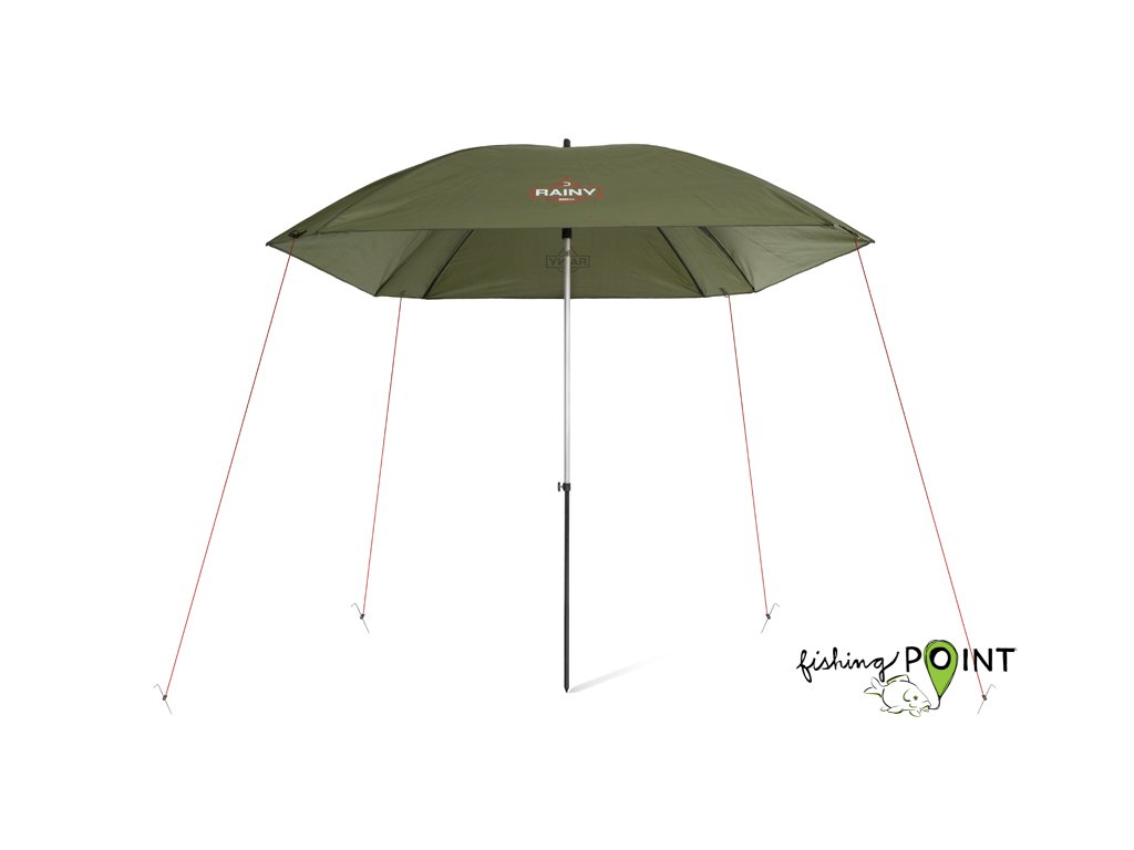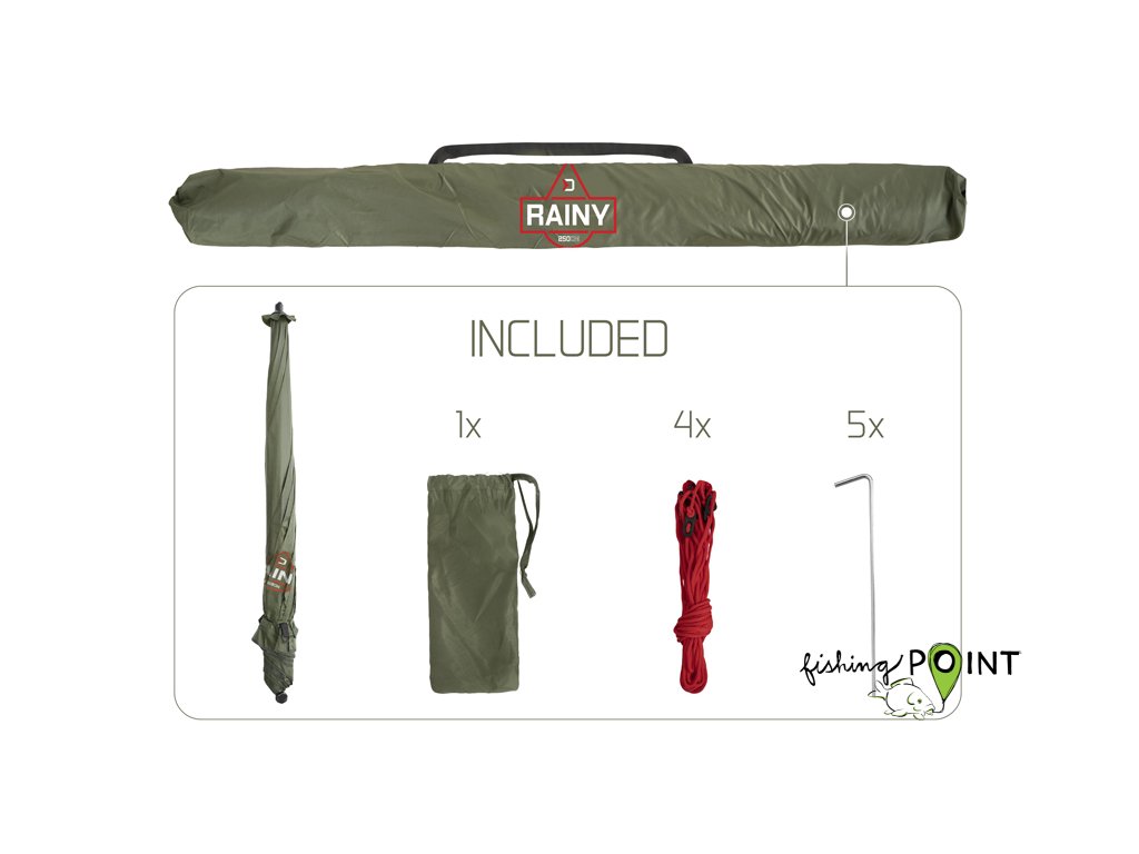 Deštník RAINY je přímo předurčen na situace, kdy se vypravíte k vodě na kratší dobu a nechcete, aby vás zaskočila nepřízeň počasí. Představuje výbornou ochranu před ostrými slunečními paprsky, rosou či srážkami. Jeho hlavními přednostmi jsou rychlost a jednoduchost rozložení či nízká hmotnost. Kromě toho se však vyznačuje specifickým hranatým tvarem kopule. Právě díky tomu deštník zakryje větší plochu v porovnání s klasickým deštníkem o stejném rozměru. Švy deštníku jsou důkladně podlepeny voděodolnou páskou pro zajištění 100% nepromokavosti i v případě silného deště. Výšku a sklon deštníku lze přizpůsobit podle potřeby, což zároveň usnadní jeho upevnění i v členitějším terénu. Technické parametry: Max.výška deštníku (až po vrch kopule): 215 cm Průměr přes kopuli: 250cmDoplňkové parametry