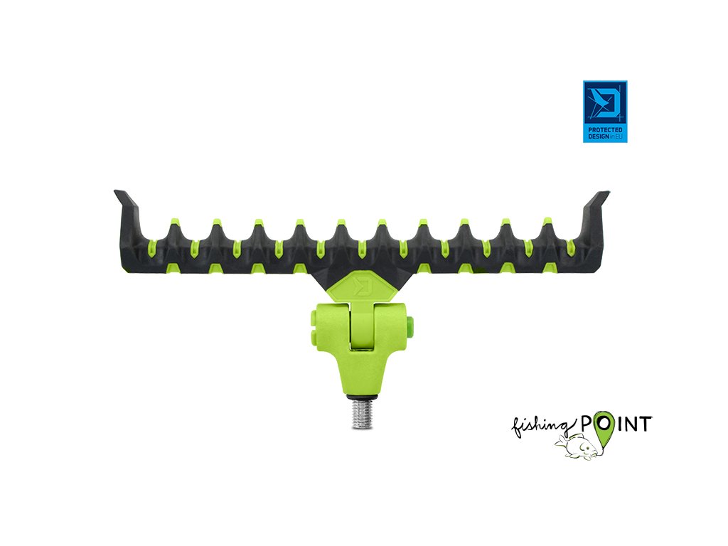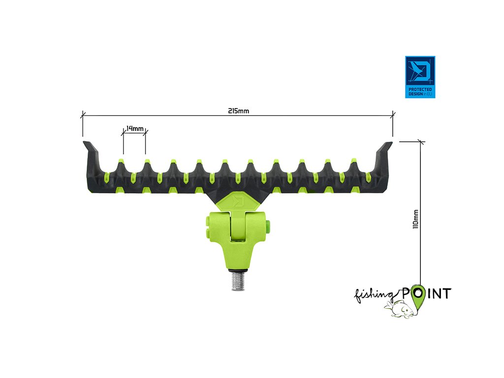 Prémiový feederový držák vysoké kvality v barvách inovativní feederové série Delphin Reaxe. Jak už název napovídá, model Flexi je plně naklápětelný pomocí jednoduchého mačkacího mechanismu, kterým umožňuje přizpůsobit se různému sklonu prutu, například během lovu na řece, ve větru nebo z nerovného terénu. Díky dostatečné šířce umožňuje upravit polohu prutu po nahození a tak docílit optimálního ohybu špičky bez potřeby nadměrného navíjení vlasce zpět na cívku navijáku. Držák je vyroben z odolných materiálů, takže se snadno nepoškodí a nepoškrábe. Jeho speciálně navržený tvar poskytuje dokonalou podporu prutu a zabrání jeho vysmeknutí i při razantních záběrech. Povrch držáku je potažen pogumovaným materiálem, který je extra šetrný k povrchu prutu a chrání jej před poškozením. Univerzální závit umožňuje uchycení na všechna standardní ramena, stojany a vidličky. Na závitové části se nachází gumová podložka, která zamezuje otáčení držáku. Držák Flexi lze použít i pro lov se dvěma pruty. Technické parametry: Celková délka: 215mm