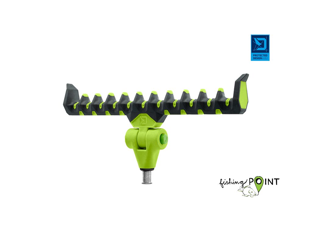 Prémiový feederový držák vysoké kvality v barvách inovativní feederové série Delphin Reaxe. Jak už název napovídá, model Flexi je plně naklápětelný pomocí jednoduchého mačkacího mechanismu, kterým umožňuje přizpůsobit se různému sklonu prutu, například během lovu na řece, ve větru nebo z nerovného terénu. Díky dostatečné šířce umožňuje upravit polohu prutu po nahození a tak docílit optimálního ohybu špičky bez potřeby nadměrného navíjení vlasce zpět na cívku navijáku. Držák je vyroben z odolných materiálů, takže se snadno nepoškodí a nepoškrábe. Jeho speciálně navržený tvar poskytuje dokonalou podporu prutu a zabrání jeho vysmeknutí i při razantních záběrech. Povrch držáku je potažen pogumovaným materiálem, který je extra šetrný k povrchu prutu a chrání jej před poškozením. Univerzální závit umožňuje uchycení na všechna standardní ramena, stojany a vidličky. Na závitové části se nachází gumová podložka, která zamezuje otáčení držáku. Držák Flexi lze použít i pro lov se dvěma pruty. Technické parametry: Celková délka: 215mmDoplňkové parametry