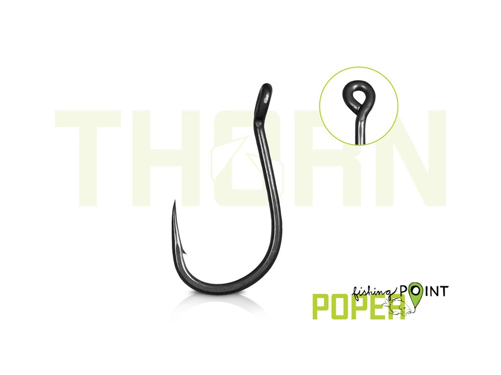 Delphin THORN je prémiová řada kaprařských háčků nejvyšší kvality. Díky moderním technologiím, které byly použity při výrobě jsou tyto háčky synonymem nekompromisní pevnosti a maximální ostrosti. Háčky ze série THORN disponují titanX povrchovou úpravou, čímž nabývají matný šedý povrch, který je navíc dokonale hladký pro snadné proniknutí do kapří tlamy. TitanX se stará také o zpevnění a odolnost celého háčku. Pomocí aplikované technologie Ultrapoint 4.8, bylo možné vytvořit delší hrot, který poskytuje přímo neuvěřitelnou ostrost. Háčky Delphin THORN jsou balené v praktické krabičce, ve které bude jejich ostří vždy důkladně chráněné. Na krabičce se navíc nachází držák s očkem pro zavěšení do prodejen, který lze snadno odstranit odlomením bez jakéhokoli nástroje díky čemuž krabička ve vaší výbavě zabere podstatně méně místa. THORN Poper je háček specifický očkem vyhnutým do vnější strany. Takové provedení ho předurčuje především pro použití s pop-up nástrahami. Výborně se hodí na tvorbu montáží jako Chod rig, Multi rig, Zig rig a podobně. Díky mírnému zakřivení hrotu dovnitř bude po záseku dokonale sedět v kapří tlamě. Technický parametr: háček osově rovnýDoplňkové parametry