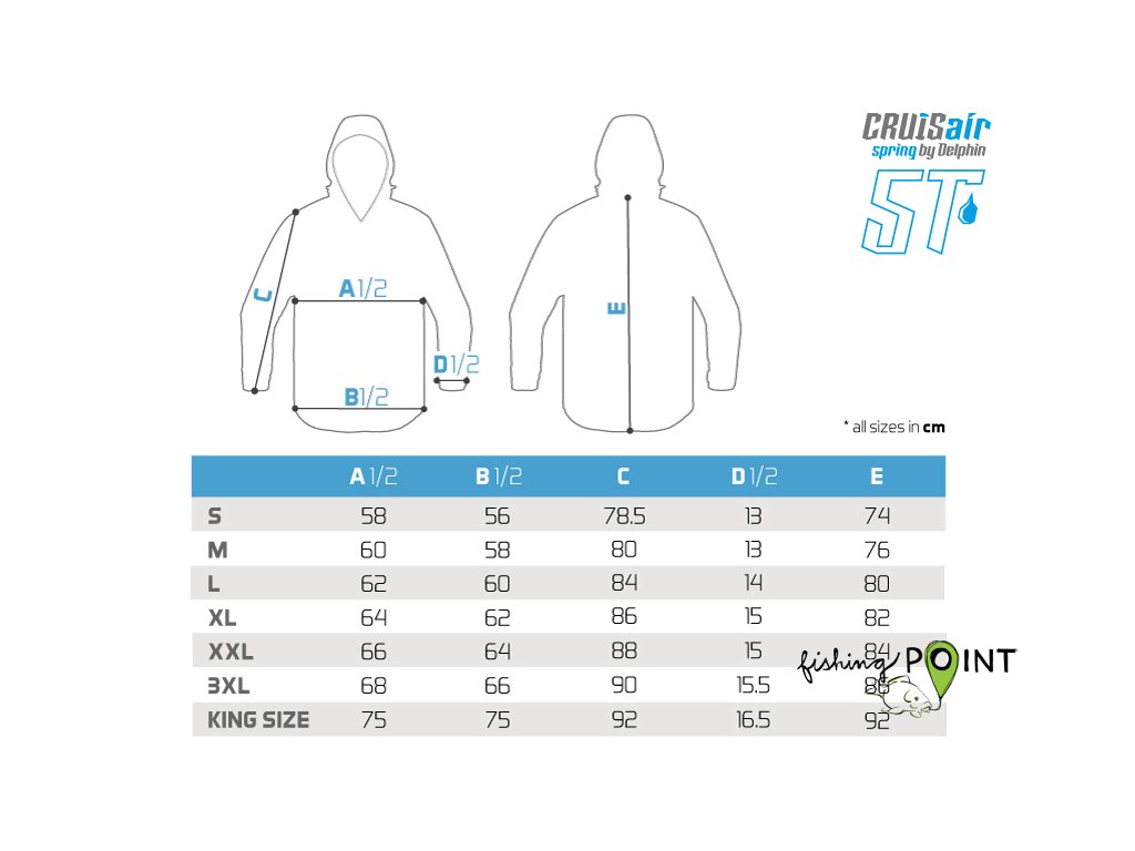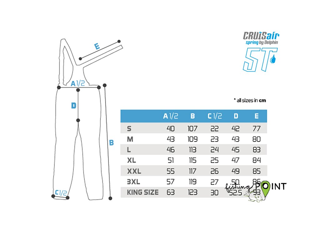 Dýchatelné svrchní oblečení nabízející excelentní ochranu vůči nepříznivým podmínkám, a to zejména dešti a větru. Delphin CruisAIR SPRING 5T je svými parametry vhodný zejména pro přechodné období jara a podzimu, kdy je počasí často nevyzpytatelné.Komplet CruisAIR SPRING 5T se skládá ze samostatně prodávané bundy a kalhot, což vám dává možnost nakombinovat si správnou velikost každého dílu. Nekompromisní kvalita použitých materiálů a odolnost vůči živlům perfektně charakterizují tento komplet. Nabízí vodní sloupec 5000mm ve spojení s paropropustností 3000g/m2/24h, díky čemuž vás nepřekvapí ani intenzivní liják, zůstanete v suchu a jen tak snadno se v něm nezpotíte.Kalhoty:Jednou z hlavních výhod kalhot je vyvýšený pas v oblasti křížů, čímž bude spodní část vašich zad dokonale chráněna. V oblasti hýždí a kolen se nachází zesílená černá látka, jejímž úkolem je ochrana před znehodnocením, těchto používáním nejvíce náchylných částí kalhot. Elastické kšandy se zapínáním na klipy zaručí, že kalhoty budou dobře sedět a nebudou vám padat. Zapínání pasu je provedeno z kvalitního zipu a 2 kovových cvoků, nechybí ani poutka po obvodu sloužící pro použití pásku. Ve spodní části lze kalhoty regulovat pomocí krytého zipu a zatahovacího pásu se suchým zipem.Při praní doporučujeme použít speciální prací prostředek na funkční oblečení, prát při max. 30°C, neždímat, nežehlit a v případě potřeby použít impregnační přípravek, který obnoví vodoodpudivou úpravu vnějšího materiálu.Doplňkové parametry