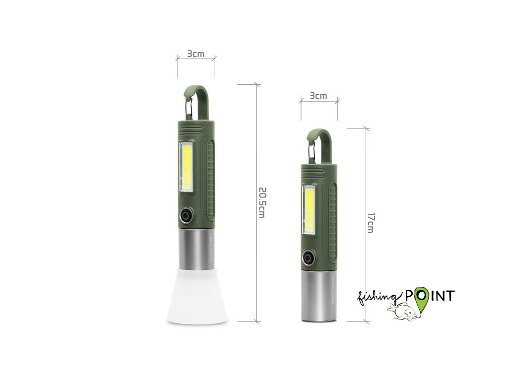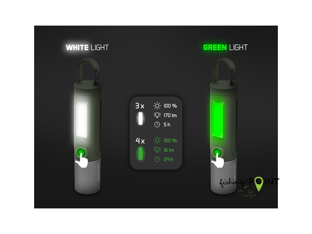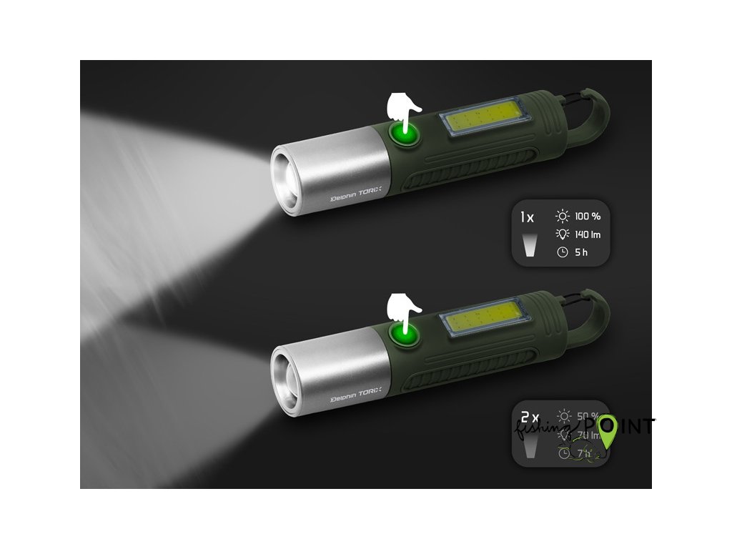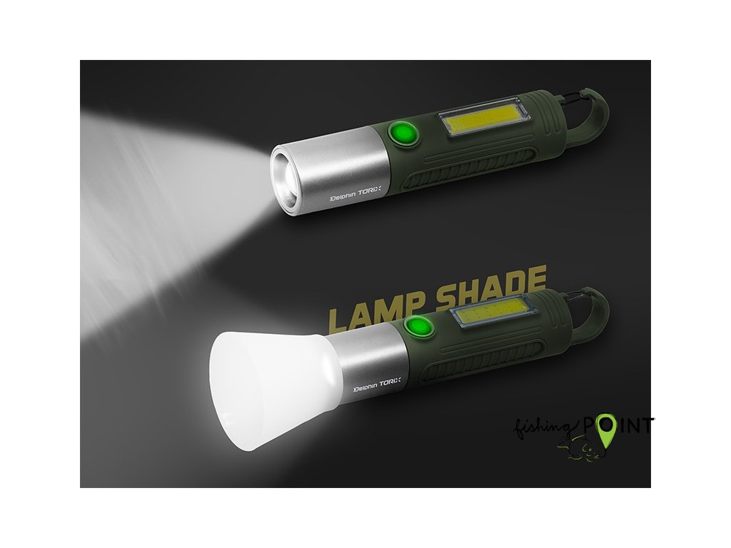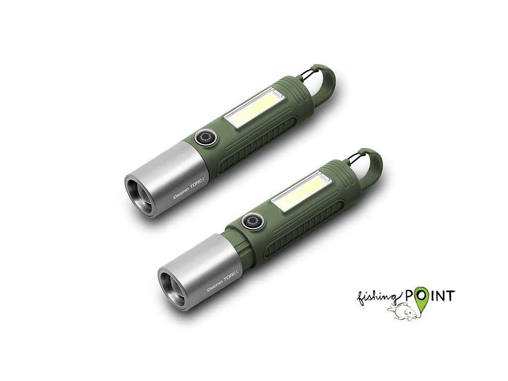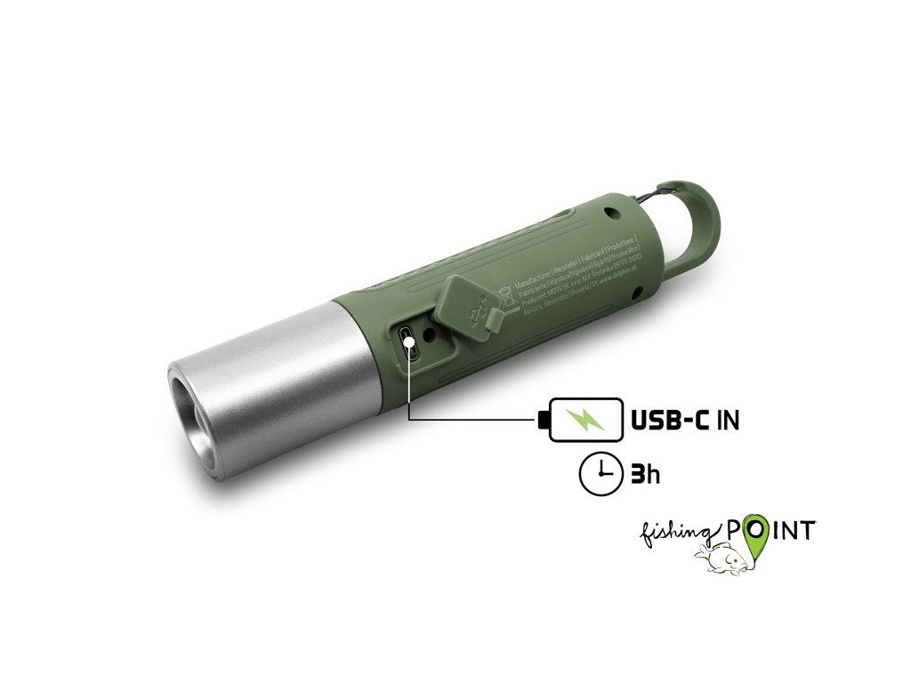 Delphin Torix je praktická nabíjecí svítilna s univerzálním využitím. Můžete jej použít jako klasickou baterku, lampu do bivaku nebo jako spolehlivého pomocníka při nočním nahazování – zejména díky funkci ZOOM, která umožňuje přizpůsobit šířku světelného kužele přesně podle potřeby. Svítilna je vybavena dvěma LED diodami s možností přepínání mezi bílým a zeleným světlem. Ovládání probíhá prostřednictvím spínacího tlačítka, které se nachází přímo na těle svítidla. Prvním stisknutím se aktivuje hlavní dioda s funkcí ZOOM a 100% intenzitou svícení (140 lumenů), přičemž výdrž baterie v tomto režimu je přibližně 5 hodin. Druhý stisk sníží intenzitu světla na 50 % (70 lumenů). Třetím kliknutím se zapne druhá dioda s bílým světlem a plnou intenzitou 170 lumenů, ve které svítilna vydrží fungovat přibližně 5 hodin. Čtvrtým stisknutím se aktivuje zelené světlo, ideální například jako poziční osvětlení – jeho výdrž dosahuje až 24 hodin. Mezi největší přednosti svítidla Delphin Torix patří právě funkce ZOOM. Pomocí výsuvné části můžete snadno přiblížit nebo oddálit čočku, čímž upravíte šířku světelného kužele – od širokého rozptýleného svitu až po úzký koncentrovaný paprsek, ideální například pro noční nahazování. V balení se nachází také praktické stínítko, které jednoduše nasadíte na reflektor. Díky němu se ze světelného paprsku stane příjemně rozptýlené osvětlení, ideální do bivaku či stanu. Kuželovitý tvar stínítka navíc zajišťuje stabilitu při postavení na rovný povrch. Na vrchní části se nachází háček, který umožňuje snadné zavěšení - například za ouško v bivaku nebo na větev. Delphin Torix je napájen zabudovaným akumulátorem typu 18650 s kapacitou 2200 mAh. Nabíjení probíhá pomocí USB-C kabelu, který se také nachází v balení. Úplné nabití trvá přibližně 3 hodiny. Stav nabití lze průběžně sledovat pomocí spínacího tlačítka, které má na sobě indikátor stavu baterie. Tělo svítidla je navrženo tak, aby odolávalo běžnému mechanickému opotřebení, ale i vnějším vlivům. Delphin Torix je spolehlivá, kompaktní svítilna, na kterou se můžete spolehnout za každých okolností. Technické parametry: Rozměry: 17x3cm Režimy svícení: Hlavní LED dioda – bílé světlo (100%-5h, 50%-7h), druhá LED dioda – bílé světlo 100%-5h, zelené světlo 100%-24h Napájení: Li-Ion zabudovaný akumulátor typ 18650, 2200mAh 3.7V Světelný výkon: 170 lm Nabíjení: USB-C (pomocí přiloženého kabelu)Doplňkové parametry