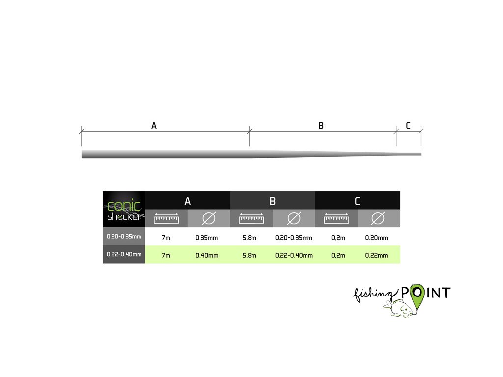 Delphin Conic SHOCKER REAXE je kónický šokový vlasec, díky kterému nahazování na velké vzdálenosti nabývá nového rozměru! Pod označením REAXE se ukrývají průměry speciálně určené pro feederový či method feederový lov. Podstata kónicky zúženého vlasce spočívá v postupně se měnícím průměru, díky čemuž je možné spojit jej s kmenovým vlascem pomocí velmi malého uzlíku. Právě to je jedním z klíčových parametrů pro mnohem snazší odvíjení vlasce z cívky a pro hladký průchod očky. Na opačném konci je však dostatečně tlustý a pevný, aby bez problémů odolal překážkám pod vodní hladinou či výpadům velkých ryb. Zároveň se do prutu můžete opřít plnou parou, bez obav o odtržení koncové sestavy při krátkodobém přetížení během nahazování. Kombinace zmíněných faktorů zaručuje, že při nahazování budete schopni dopravit své montáže podstatně dále než při použití klasické „šokovky“ se stejným průměrem po celé délce. V balení na cívce se nachází navinutých 6 kusů návazců o délce 13 metrů, které jsou vždy označeny nálepkou.Doplňkové parametry