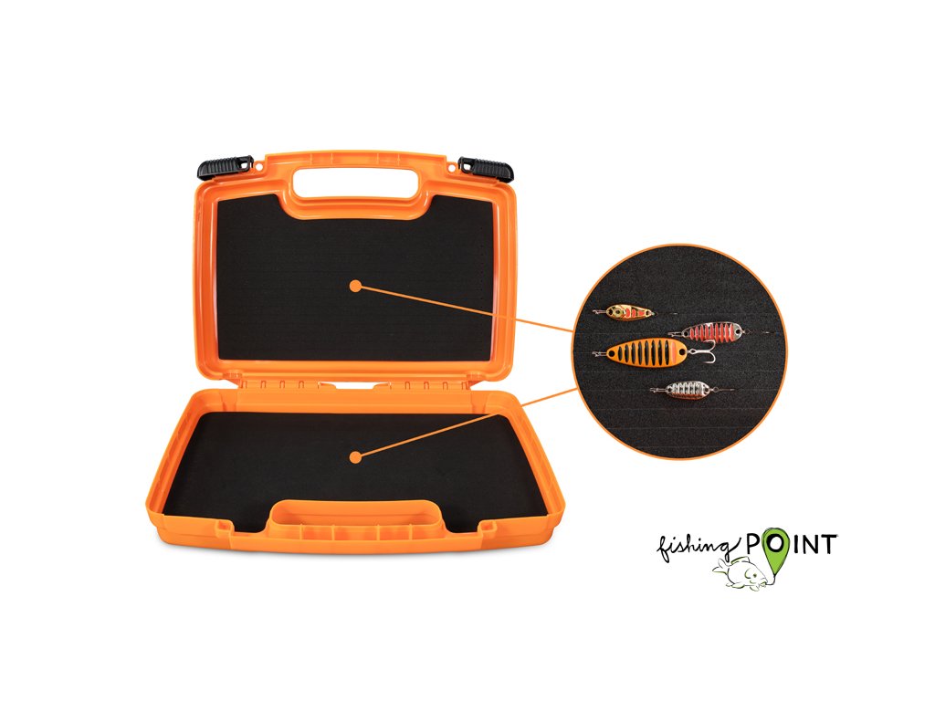 LureBOX MEGA je praktický kufřík pro uschování přívlačových nástrah, komponentů montáže a různých doplňků. Velkou výhodou je vnitřní výplň z EVA pěny. V pěně jsou umístěny zářezy pro snazší uschování napíchnutých gumových nástrah na jigách. Stačí jednoduše jigový háček zatlačit do zářezu, nástraha zůstane nepoškozená a pěna ochrání hrot háčku proti zatupení. Také je možné krabici použít jako odkládací prostor pro TWISTO systémy bez nechtěného motání. Velmi jednoduše lze v krabici uložit i samostatné háčky, díky čemuž budete mít vše potřebné připravené k lovu. Vyrobena je z oranžového neprůhledného plastu, který redukuje možnost koroze v případě uložení již použitých komponentů.Technické parametry: