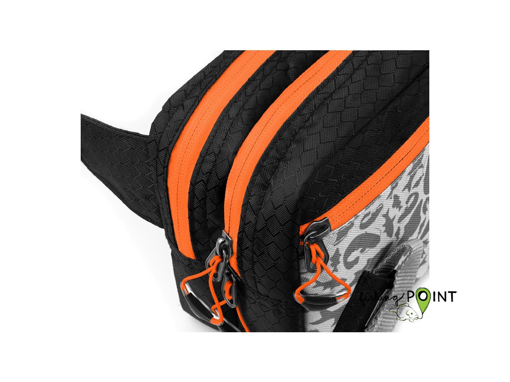 Ledvinka Delphin ATAK! Belty je praktický doplněk pro každého, kdo se věnuje lovu na přívlač. Tvoří ji dvě stejně velké kapsy, které vepředu doplňuje jedna malá kapsa. Do nich si můžete uložit různé příslušenství nebo nástrahy, které tam budou čekat na ten správný okamžik. V přední části najdeme i praktický držák určený pro peán nebo kleště s úchytem na suchý zip. Kolem pasu se připíná pomocí plastového klipu oranžové barvy, který je připevněn na popruh černé barvy.Kvalitní vnější zipy oranžové barvy jsou vybaveny plastovými taháčky na oranžovém popruhu, který je na konci rozšířený, a proto je možné ho rychle uchopit. Doplňky oranžové barvy umožňují rybáři, aby byla taška dobře viditelná i za šera a věděl ji okamžitě najít. Taška je ušita z lehké, ale přitom odolné látky černé barvy. Design tašky doplňuje naše jedinečná šedá ATAK! kamufláž se siluetami dravých ryb.