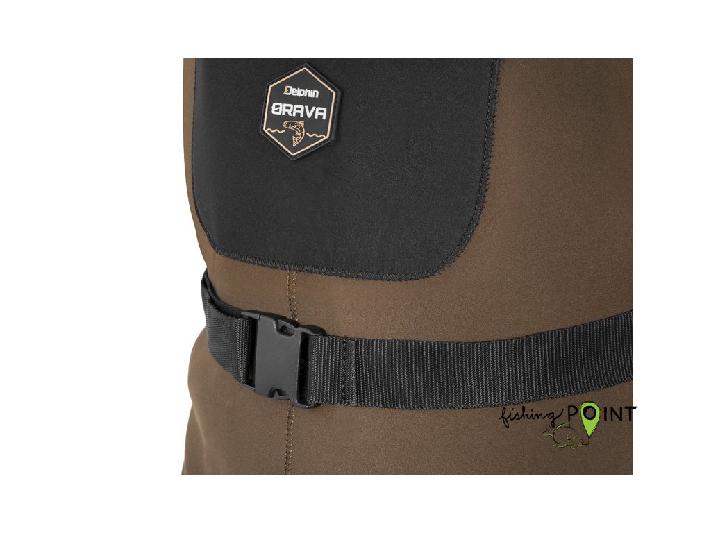 Při zimním rybaření je třeba myslet hlavně na tepelný komfort. Ten dokážou ideálním způsobem zajistit neoprenové prsačky Delphin ORAVA. Vyznačují se kvalitním provedením a elegantním designem. Každé prošití a namáhané spoje jsou precizně ošetřeny, aby zabránily nechtěnému prosakování. Hnědá barva neoprenu zamezí vzniku velkého množství viditelných skvrn ze slizu a dalších různých nečistot. Neodmyslitelným pomocníkem je neoprenová kapsa na přední straně prsaček, kde si můžete odložit například povolení k rybolovu. Nemusíte se bát ani kleknutí na zem, protože v kolenní části jsou prsačky zpevněny dvojitou vrstvou neoprenu. Nastavitelné popruhy na ramena jsou také vybaveny neoprenovou výstelkou, aby bylo nošení prsaček během celodenních vycházek pohodlné a ramena méně namáhána. Pod šlemi se také nacházejí dva plastové kroužky, na které lze pomocí joja, nebo karabiny uchytit různé pomůcky, jako například pean nebo metr. Součástí balení je i brodící pásek, který zamezí natečení vody do prsaček při nechtěném uklouznutí nebo pádu. Pryžové kozačky s odolnou a stabilní podrážkou vás podrží i v náročnějších podmínkách. Jejich vnitřek je vystlán neoprenovou vložkou, která chrání nohy před chladem.Složení: Neopren/PVC