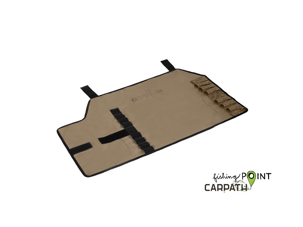 Delphin Area STICK je praktický obal na vidličky vyrobený z poměrně hrubé textilie, která je pouze z vnitřní strany pogumovaná, a proto je možné vnitřní stranu i lehce očistit od případných nečistot. Je navržen tak, abychom do něj uložili až 8 ks vidliček i hrubšího průměru, které mají ostrý hrot jako například naše C-STICK nebo D-STICK. Proto jsme spodní část, která je určena pro zasouvání hrotů, vybavili hrubým a zesíleným materiálem. Nyní se vám už nestane to, že by vám ostrý konec propíchl tašku nebo jinak poškodil věci uložené v ní. Obal s vidličkami jednoduše srolujete a zafixujete suchým zipem, který slouží i jako ochrana proti poškrábání. Pouzdro má na vrchní straně našitý popruh, který slouží jako madlo pro přenos pouzdra. Dodávaný je v naší jedinečné hnědé Carpath kamufláži se siluetami kaprů.Technické parametry: