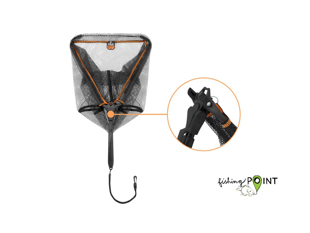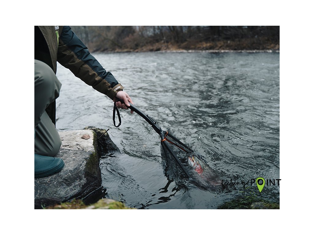 Je praktický podběrák, který ocení zejména vláčkaři a muškaři lovící na tekoucích vodách. Díky kompaktním rozměrům a klipu na rukojeti jej lze upevnit na opasek brodících kalhot, čímž je okamžitě k dispozici. Jednoduchý mechanismus umožňuje jeho rychlé rozložení a složení jednou rukou, což oceníte zejména při zdolávání ryby při zabrodění ve vodě. Měkká pogumovaná síťka je šetrná k rybě a zároveň nenasává nepříjemné pachy.Ergonomicky tvarovaná rukojeť poskytuje spolehlivý úchop za každých podmínek. Na konci rukojeti se nachází elastický popruh s karabinou pro uchycení například na opasek.