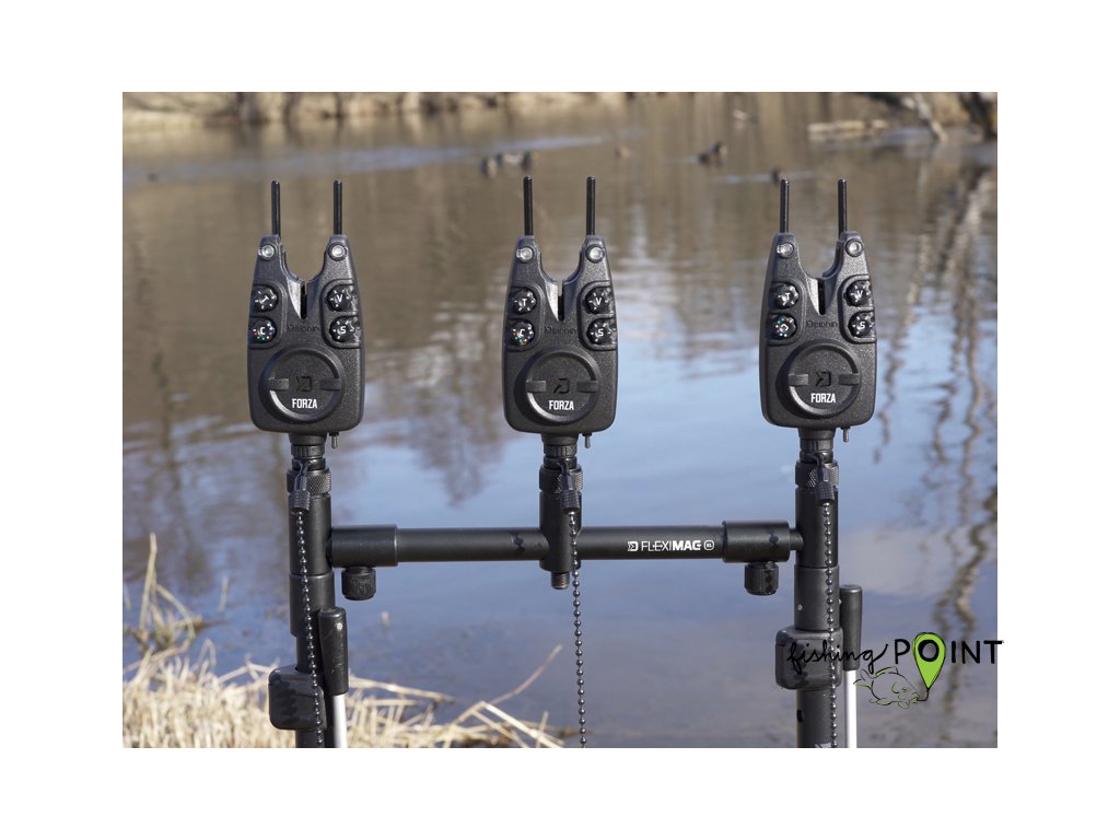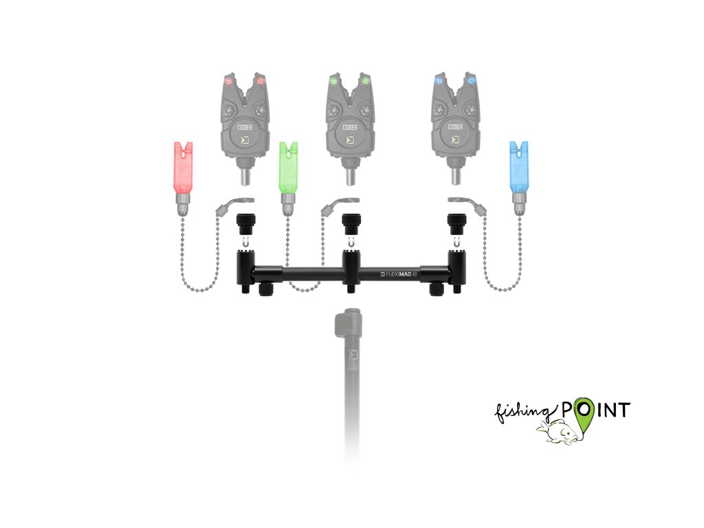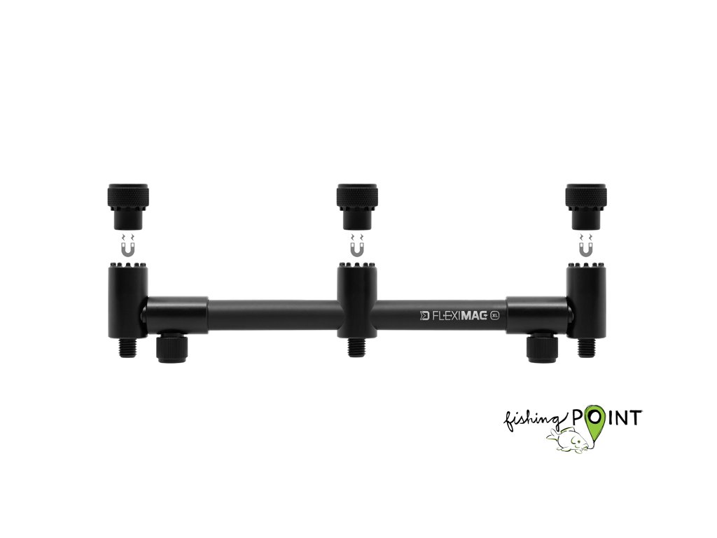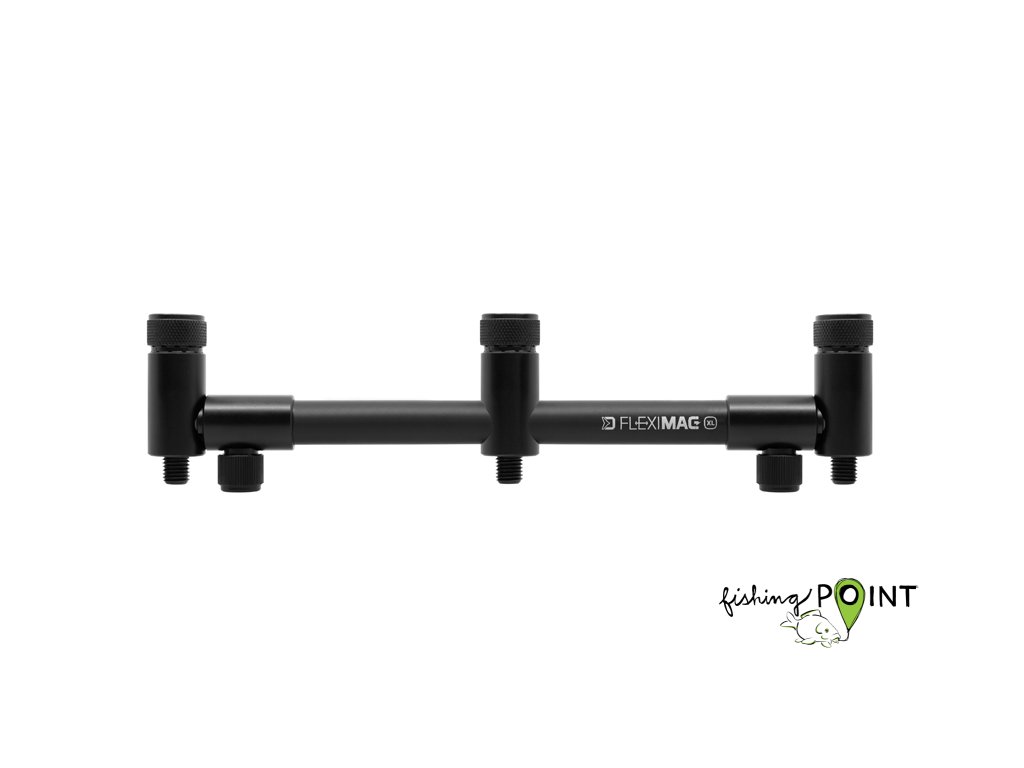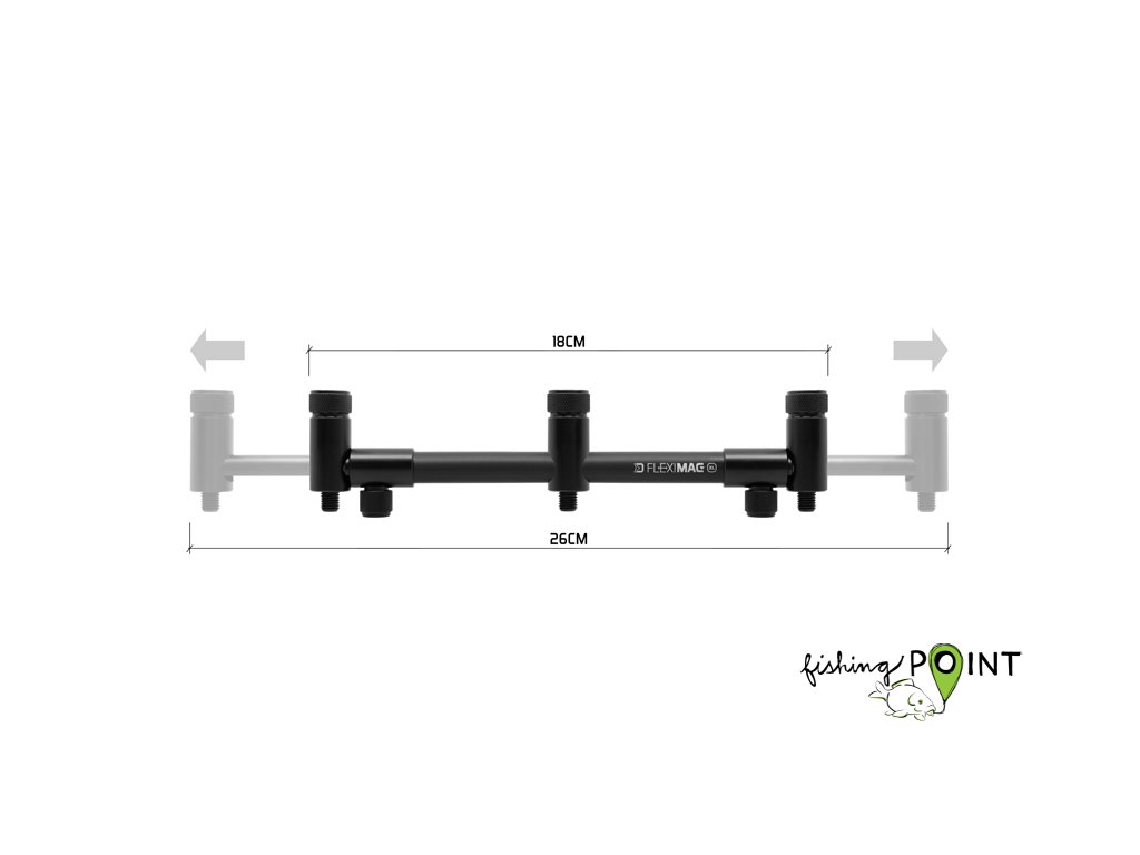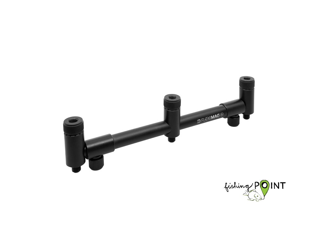 Hrazda na pruty s magnetickými rychlospojkami a univerzálním závitem, kompatibilní s většinou vidliček a bouřkových tyčí dostupných na trhu. Výhodou rychlospojky je, že si můžete signalizátory a zadní držáky ponechat zašroubované v závitu a v případě potřeby jednoduše vytáhnout z hrazdy, nebo zasunout zpět při zahájení lovu. Jednotlivá ramena jsou výsuvná, a tedy je možné si šířku hrazdy přizpůsobit podle svých potřeb podle velikosti navijáků. V oblibě je také roztažení přední hrazdy a vytvoření vějířového rozložení prutů, při kterém špičky směřují mírně od sebe. Ramena jsou ze spodní části seříznuta do roviny, takže po utažení pojistných šroubů perfektně drží na místě a neprotáčejí se. FlexiMAG BUZZ je vyrobena z pevného hliníku, potaženého odolnou černou práškovou barvou. Dodáváme ji ve dvou velikostech, konkrétně kratší L určená na dva a delší XL na tři pruty. Technické parametry: Délka: FlexiMAG BUZZ XL: 25-35cmDoplňkové parametry
