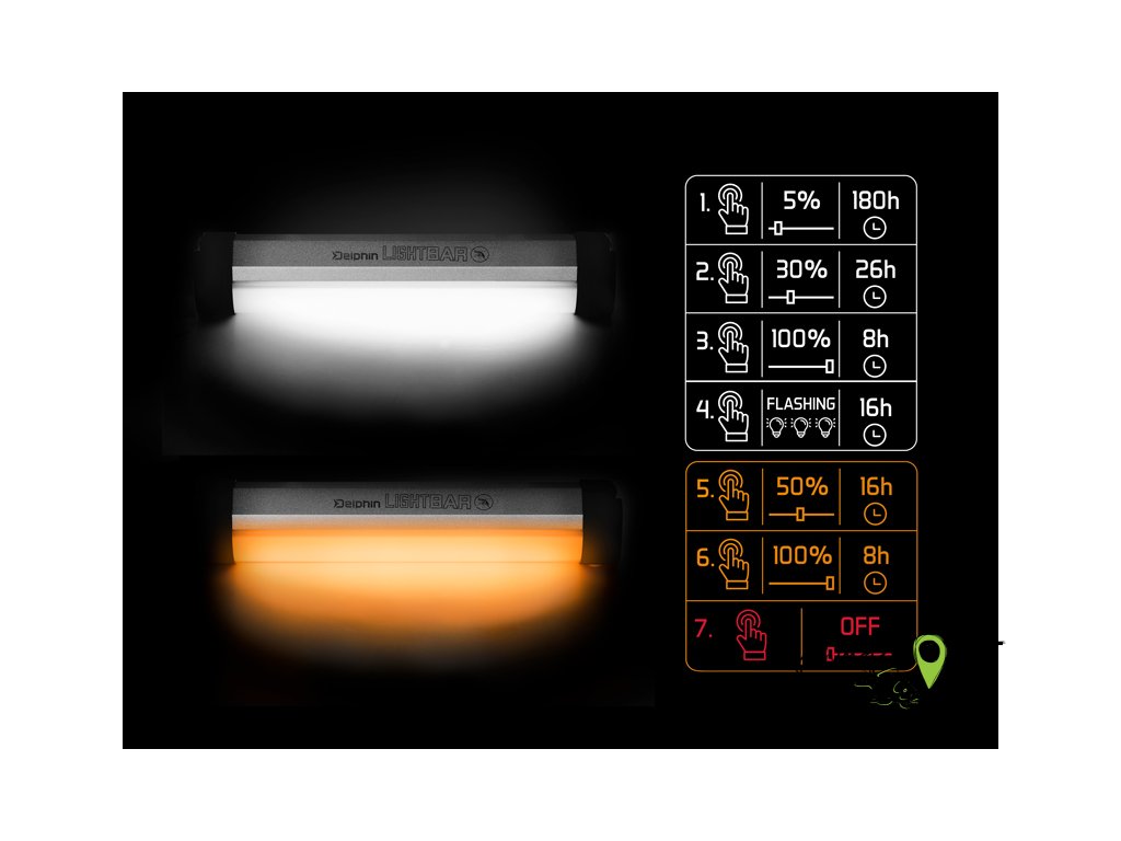 Delphin LightBAR UC je vysoce praktické bivakové světlo, díky němuž vás tma více nezaskočí. Disponuje dvěma barvami, přičemž každá z nich má několik úrovní svícení. Při prvním stisknutí se rozsvítí bílé světlo s 5% svítivostí. Druhým stiskem se rozsvítí na 30% a při třetím stlačení září bílé světlo na 100%. Při čtvrtém stisknutí se bílé světlo rozbliká, což oceníte například při vyvážce na velkých vodních plochách, kdy budete schopen jasně definovat, kde se na břehu nachází váš tábor. Pokud stačíte tlačítko 5x, změní se barva z bílé na oranžovou s 50% svítivostí. Při šestém stlačení se oranžové světlo rozsvítí na 100%. Taková barva má několik výhod. Kromě toho, že je neokoukaná, podstatně eliminuje přítomnost komárů a jiného hmyzu ve vašem okolí, což je k nezaplacení zejména při večerním posezení u vody. Počet stisknutí platí pro manuální ovládání přímo spínačem na světle. Samozřejmostí je ale také přibalený dálkový ovladač, který samostatně ovládá bílé a oranžové světlo, a tím výrazně zkracuje reakční dobu pro změnu světla. Kromě něj k světlu dostanete také napájecí kabel USB-C a dvě závěsná poutka na světlo i ovladač. Upevnění produktu je elegantně vyřešeno pomocí magnetů, umístěných přímo na světle a jedním plochým kovovým protikusem. Za pomoci těchto prvků lze Lightbar snadno umístit kdekoliv na bivak, či jiný rybářský přístřešek a bude vždy spolehlivě držet na svém místě. Technické parametry: Rozměry: 203x39x38mm Režimy: 4 režimy svícení bílým světlem (5%-180h, 30%-26h, 100%-8h, blikání-16h), 2 režimy oranžového světla (50%-16h, 100%-8h) Napájení: Li-Ion akumulátor, 3.7V, 2000 mAh Světelný výkon: 100lm Nabíjení: USB-C (pomocí přiloženého kabelu) Doba nabíjení: 4hDoplňkové parametry
