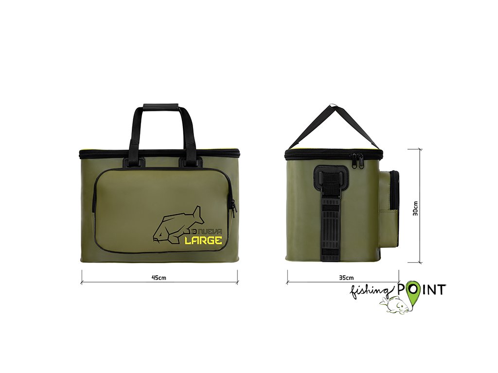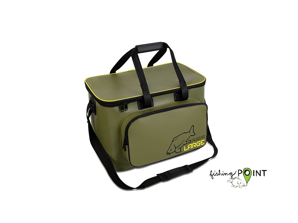 CarryAll taška Delphin NuEVA Large o rozměrech 45x30x35cm je univerzální rybářská taška vyrobená z EVA materiálu, poskytující velkorysý prostor pro uskladnění nejrůznějšího rybářského vybavení či různých nástrah a návnad. Díky použitému EVA materiálu a kvalitním svárům je taška nepromokavá, čímž dokonale ochrání obsah uvnitř i v nepříznivých povětrnostních podmínkách. Kromě nepromokavosti je tento materiál také velmi snadno omyvatelný a neabsorbuje pachy. Bez obav tak uvnitř můžete přenášet také různé tekuté potravy, dipy či boostry. Extra prostor pro drobnější příslušenství poskytuje zipovatelná kapsa na přední straně. Série tašek NuEVA je designována v kombinaci decentní barvy s logem kapra, což potěší množství příznivců kaprařiny. Pro snadný transport je taška opatřena praktickým, délkově nastavitelným popruhem na rameno, ale také dvěma popruhy do ruky. Rozměr: 45x30x35cm Rozměr přední kapsa: 35x20x6cmDoplňkové parametry