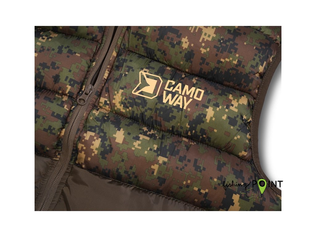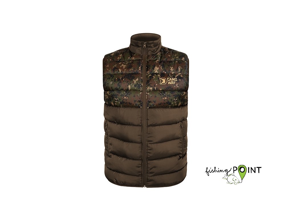 Zateplená vesta přinášející skvělý tepelný komfort během chladných, podzimních či zimních dní. Je vyrobena z tkaniny, která je příjemná na dotek a zároveň snadno udržovatelná, což je velmi praktické při použití během rybolovu a jiných outdoorových aktivitách. Vesta je zároveň příčně prošívaná, což vytváří stylový vizuální prvek produktu. Výplň vesty je extra lehká a zajišťuje výborné termoizolační vlastnosti. Zapínání je zajištěno pomocí kvalitního zipu, překrytého z vnější strany tkaninou, což zvyšuje jeho odolnost vůči vnějším podmínkám. Na obou stranách se nacházejí dostatečně velké kapsy na ruce nebo pro odložení potřebného příslušenství. Vesta CamoWAY disponuje také vyvýšeným límcem pro lepší překrytí krku a šíje při nízkých teplotách vzduchu. Design se skládá z tmavě hnědé barvy zkombinované s digitálním camo vzorem doplněným stylovým logem CamoWAY ve světlé barvě. Materiálové složení: 100% PolyesterDoplňkové parametry