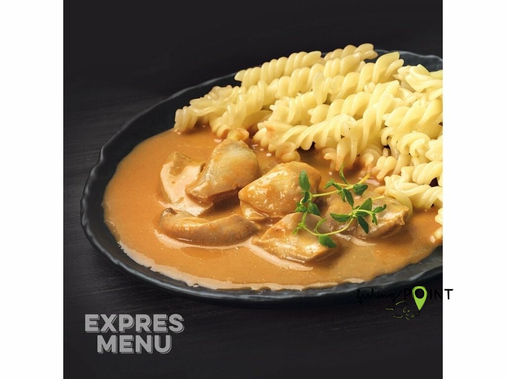 Šťavnaté kousky masa z kuřecích stehen, dušené do měkka v omáčce na cibulovém základu se sladkou paprikou a smetanou. Přílohou jsou fusilli z rýžové mouky.Hotové jídlo s přílohou ve dvou sáčcích.