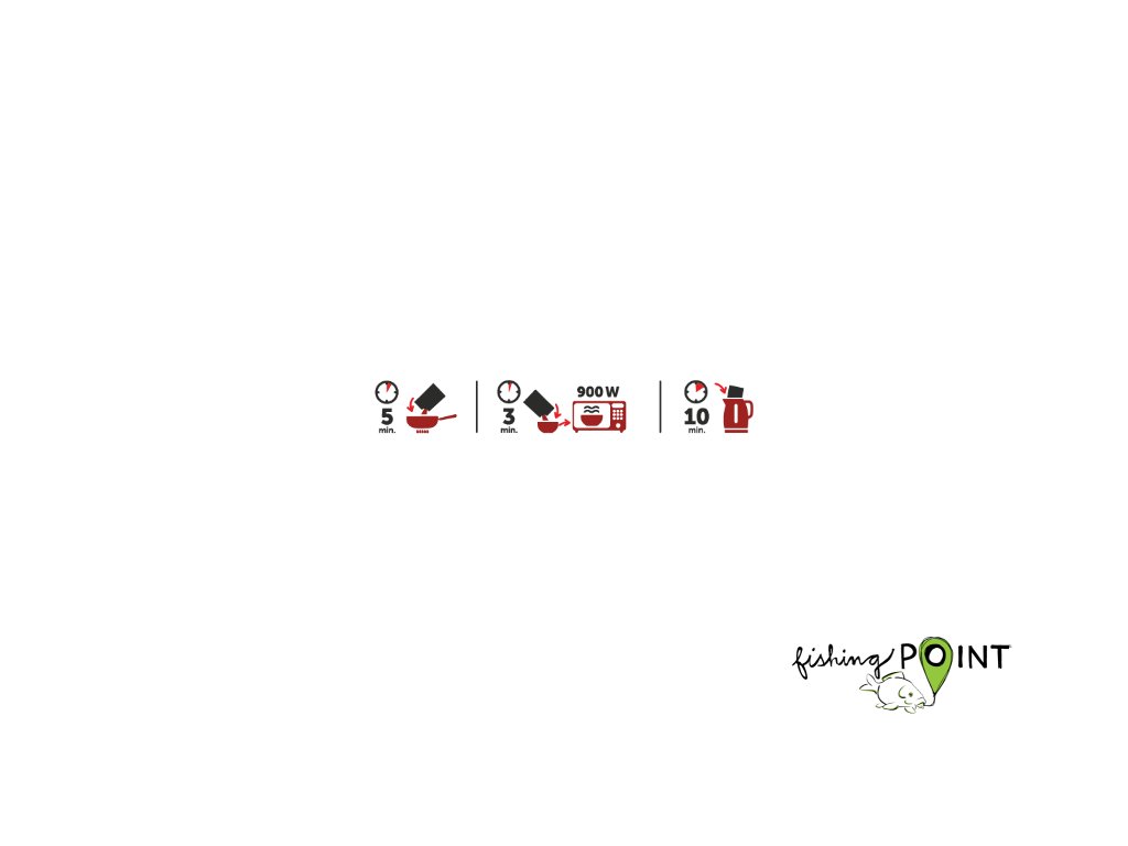 Způsob přípravy: 1) Vložte krabičku do mikrovlnné trouby a ohřívejte cca 2 minuty (700 W) nebo dokud nebude jídlo teplé. Obal výrobku se může teplem deformovat. 2) Jídlo přendejte ze sáčku na talíř a ohřívejte v mikrovlnné troubě cca 2 minuty. 3) Vyjměte sáčky z papírového obalu a oba uzavřené sáčky vložte do hrnce (či rychlovarné konvice) s vařící vodou na cca 10 minut.
