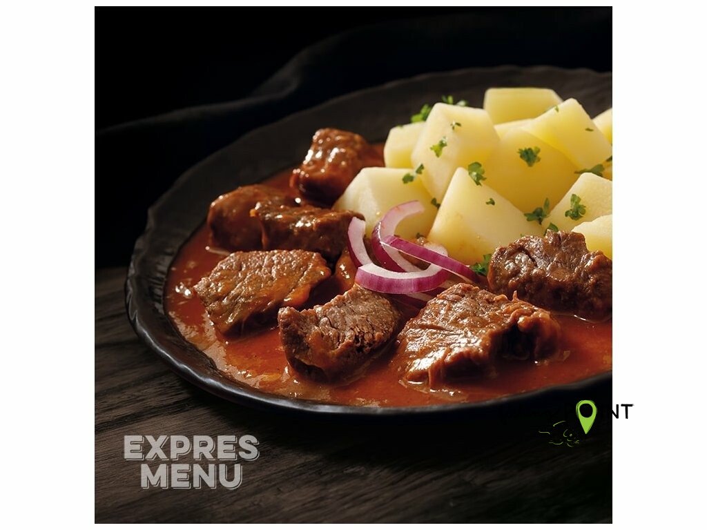 Libové kousky hovězího masa dušené doměkka v omáčce na cibulovém základu se sladkou paprikou, dochucené česnekem a majoránkou, doplněné brambory.Hotové jídlo s přílohou ve dvou sáčcích.