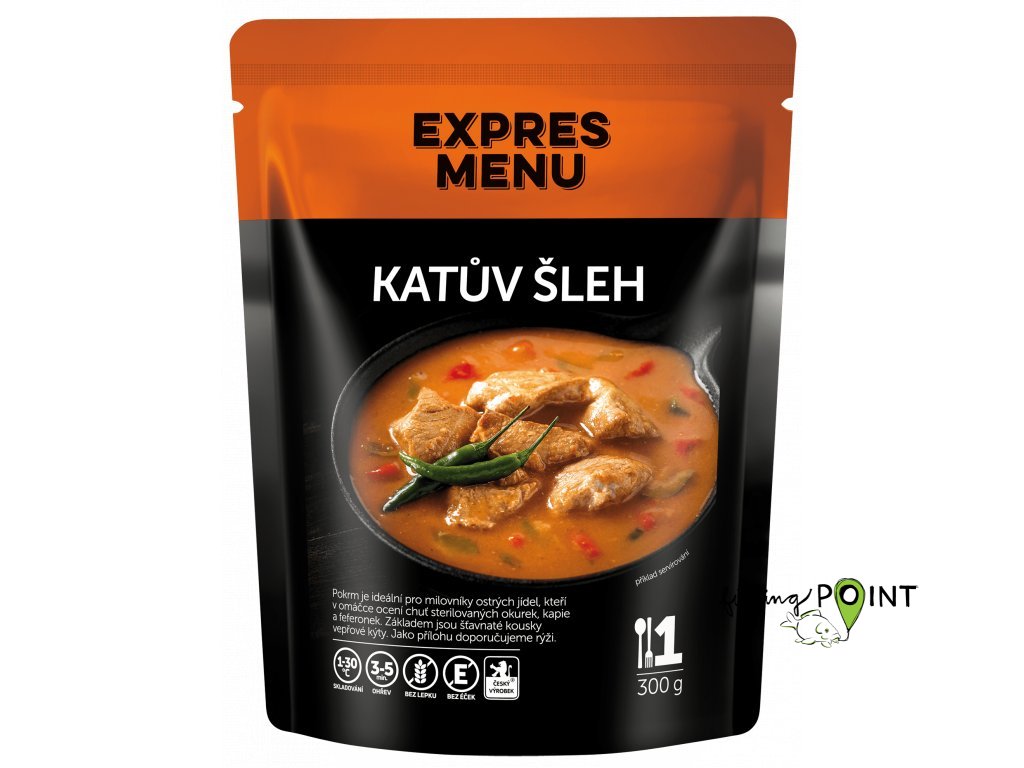 vepřová kýta (33 %), hovězí vývar (voda, hovězí maso a kosti), rajčatový protlak (voda, rajčatový protlak, sůl), kapie sterilovaná (červená paprika, voda, ocet, cukr, sůl, koření), okurky sterilované (okurky, voda, ocet kvasný, sůl, kořenící výtažek, hořčičné semínko), cibule, rýžová mouka, kukuřičná mouka, feferonky sterilované (feferonky, voda, ocet kvasný, sůl), řepkový olej, sůl kamenná, pepř.
