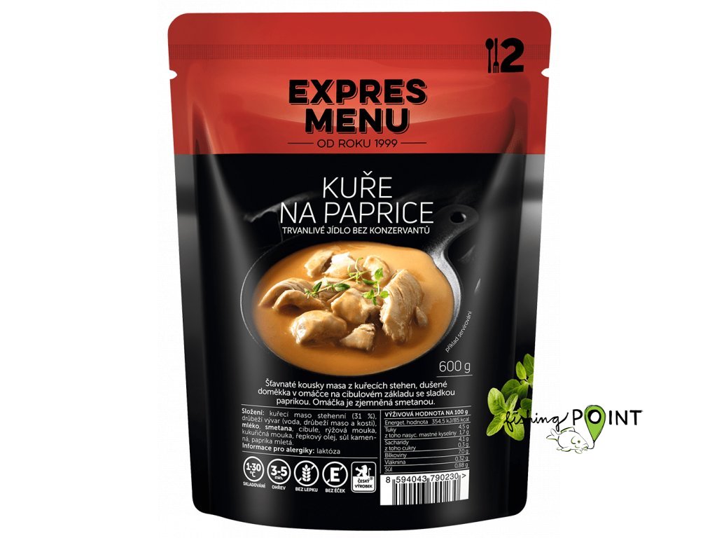 Jasný favorit dětí a všech milovníků omáčkových jídel. Pokrm připravujeme ze šťavnatých kousků kuřecího masa dušených na cibulovém základu, s paprikovou omáčkou, která je zjemněná smetanou. K tomuto jídlu se hodí prakticky jakákoliv příloha. Porce: 2 Hmotnost: 600g Popis: Šťavnaté kousky masa z kuřecích stehen, dušené na cibulovém základu s paprikovou omáčkou, zahuštěnou bezlepkovou moukou a smetanou Složení: Kuřecí maso stehenní (31 %), mléko, smetana, voda, cibule, řepkový olej, rýžová mouka, kukuřičná mouka, sůl (jedlá kamenná sůl, jodičnan draselný), paprika mletá. Informace pro alergiky: mléko, smetana Výživová hodnota na 100g Energetická hodnota 395 kJ / 94 kcal Tuky 5,4 g Nasycené mastné kyseliny 2,3 g Sacharidy 4,5 g Cukry 0,2 g Bílkoviny 7,0 g Sůl 1,1 g potravina bez lepku Hotový pokrm sterilovaný skladujte v suchu a temnu při teplotě +1 až +30 °C. Otevřený výrobek uskladněte v chladničce a spotřebujte do 48 hodin. Doba spotřeby jídel EXPRES MENU je 36 měsíců.Doplňkové parametry