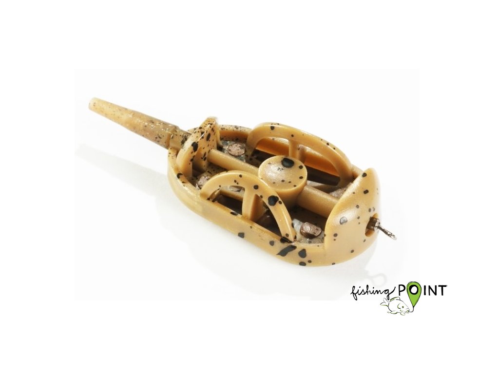 Inovovaný model method feeder krmítka s miskou v centrální části pro umístění háčku s nástrahou přímo mezi krmítkovou směs. Jeho vynikajícími vlastnostmi jsou: aerodynamický tvar s namáčknutou směsí pro daleké náhozy, plochý tvar s olověnou zátěží po celé délce pro lepší fixaci na dně (oceníte hlavně na řece).Krmítko je primárně určeno k použití v průběžné sestavě, avšak za pomocí obratlíku či gumového korálku se může zafixovat a tím nám vznikne buď pevná nebo poloprůbežná montáž. Doporučujeme ke krmítku zakoupit formičku pro tvarování krmení. Postup použití: Formičku naplníte po okraj krmením do kterého vložíte háček s nástrahou, přiložíte krmítko a zamáčknete krmením. Tím vytvoříte pevnou a symetrickou kuličku (bábovičku) kterou můžete již nahodit.Doplňkové parametry