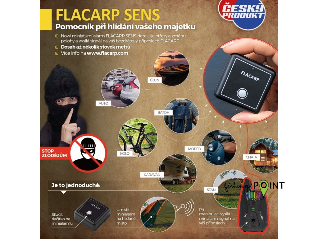 Nový miniaturní alarm, detekuje změnu polohy a vibrace. Vysílá signál na příposlech RX7 (RFX). Pomůže pohlídat vaši výbavu: člun, batoh, zaparkovaný motocykl, auto, můžete pohlídat kolo nebo jej připevnit na dveře karavanu nebo chatky. Při detekci změny polohy, vibrací nebo otřesů vyšle signál na váš bezdrátový příposlech. Vlastnosti a funkce: - rozměry jen 4 x 4cm, výška 1,5cm - napájení knoflíkovou baterií CR2450 - dosah bezdrátového signálu až několik stovek metrů (dle terénu a umístění) - možnost nastavení citlivosti dle použití Ovládání je velmi jednoduché a intuitivní: - stlačením tlačítka zapnout, odpočet času 5 sekund - po odpočtu hlídá: detekuje vibrace a změnu polohy - pro vypnutí opět stlačit tlačítko ... - při vypnutí vždy vyšle signál na příposlech, nelze tedy jednoduše překonat bez upozornění uživatele Na posledním obrázku ukázka uložení tří čidel FLACARP-SENS v kufru XXL.Doplňkové parametry