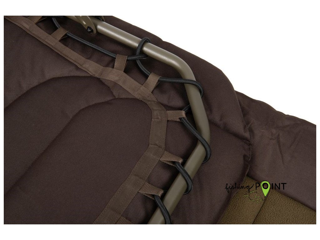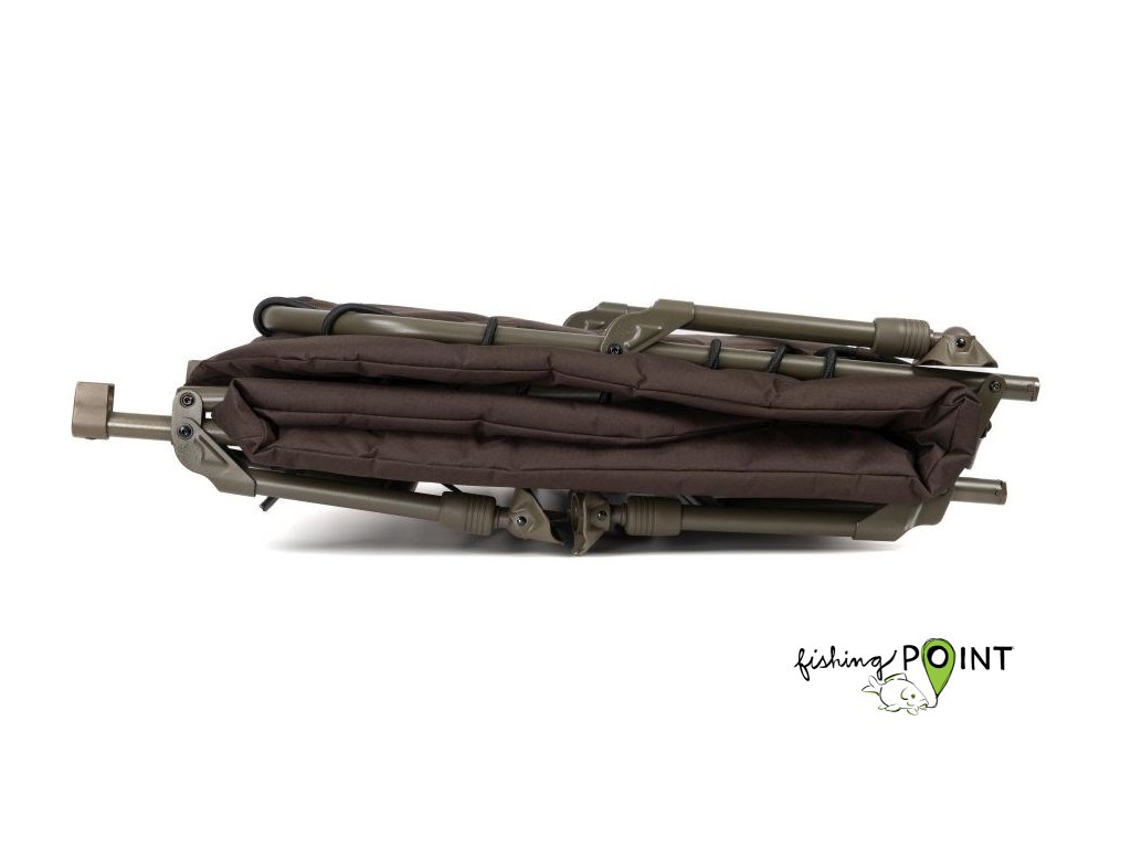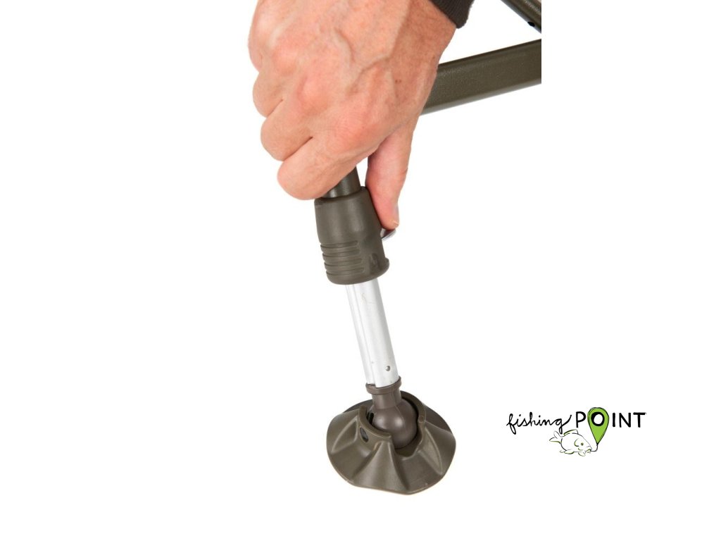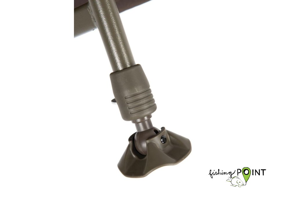 Konstrukce bez kloubů (cam-free design) poskytuje větší využitelnou šířku a spolu s plochým rámem a pohodlnou polstrovanou pěnovou matrací zajišťuje vysoký komfort při odpočinku u vody. Stabilitu i na nerovném terénu zaručuje šest výsuvných nohou s otočnými bahenními patkami.