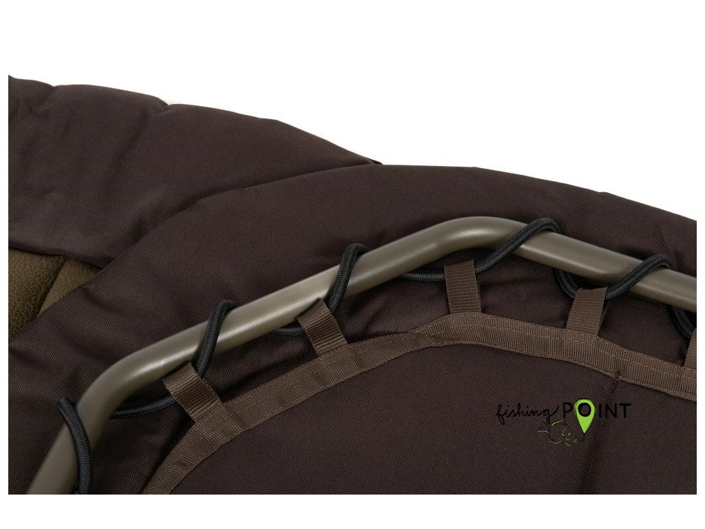 Praktický systém popruhů a přezek umožňuje lehátko kompaktně složit, a to i se spacím pytlem připevněným k lehátku.
