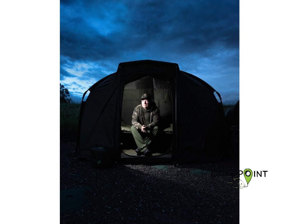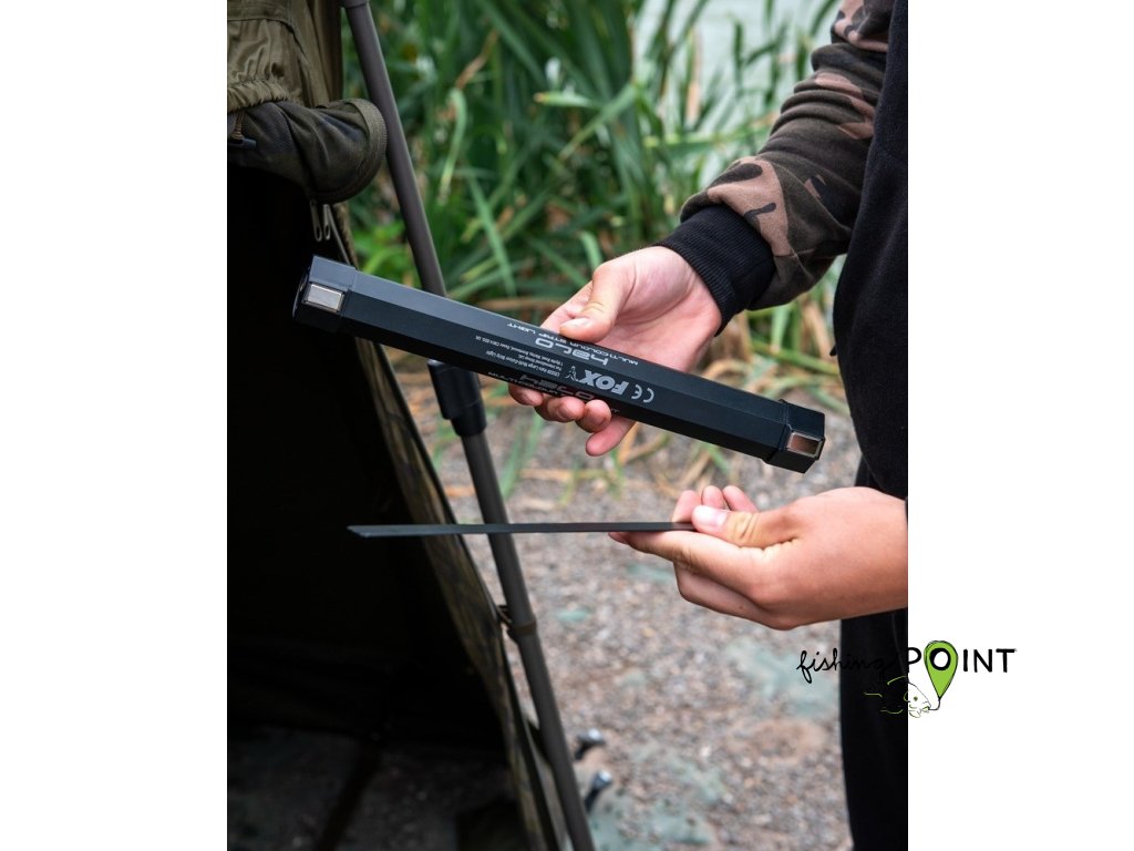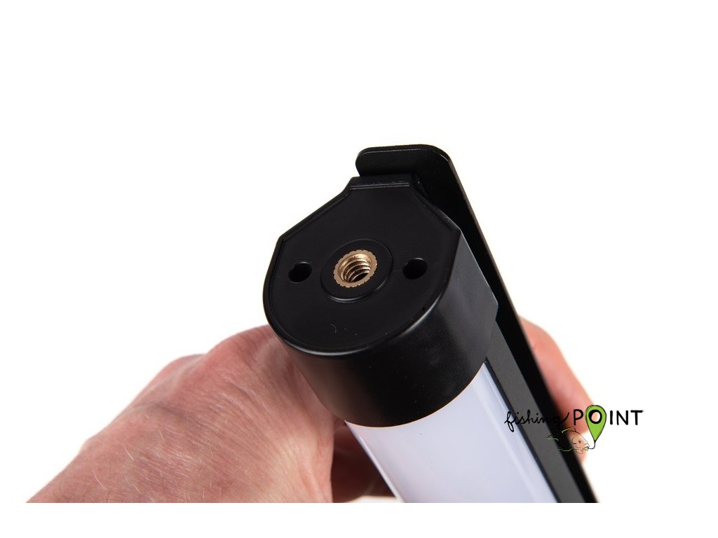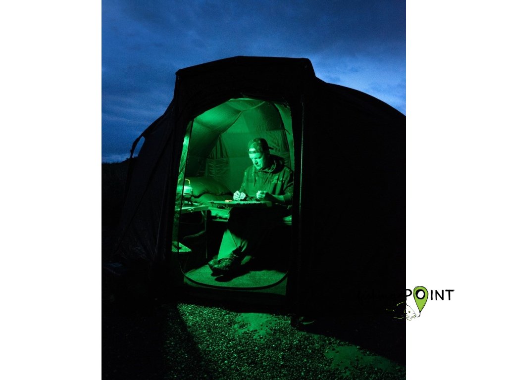 Dálkově ovládané LED světlo s magnetickým upevňovacím prvkem a kovovou destičkou pro zavěšení v bivaku.