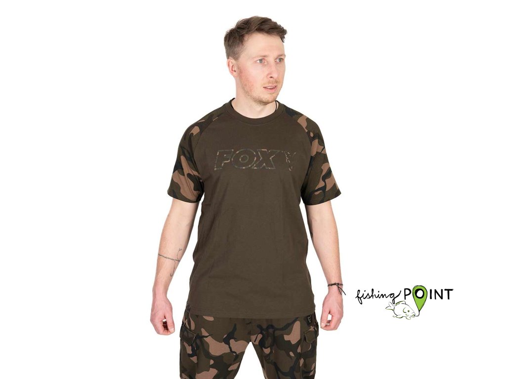 Khaki triko s Fox camo raglánovými rukávyVelké přes hrudník natištěné camo Fox logo