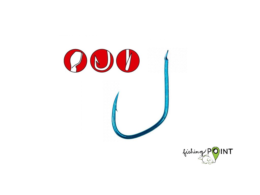 Modrý, tenký a velmi ostrý háček s lopatkou vhodný na červy a jemné nástrahy náchylné na prasknutí.