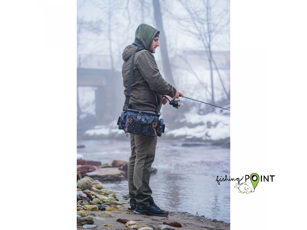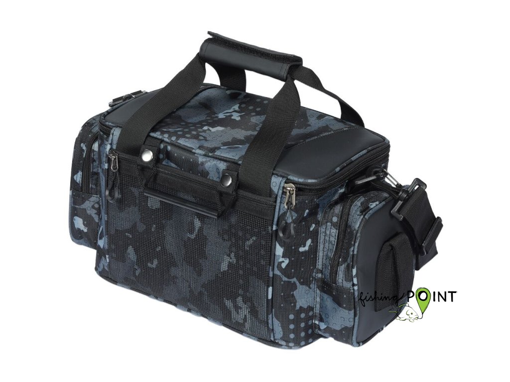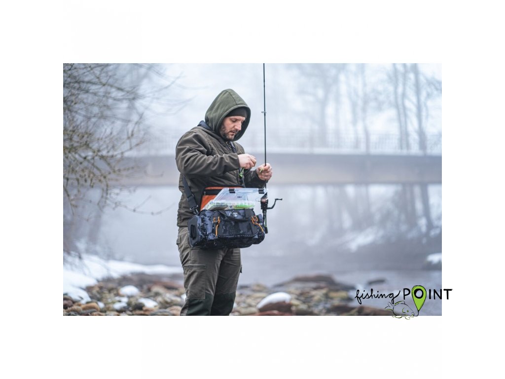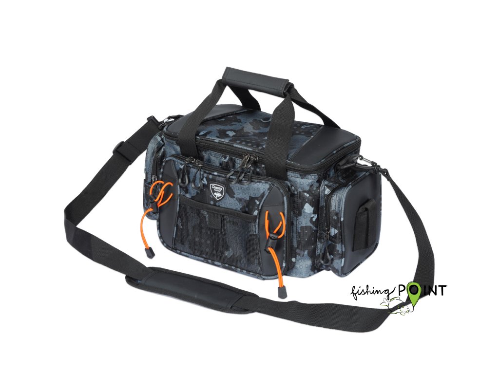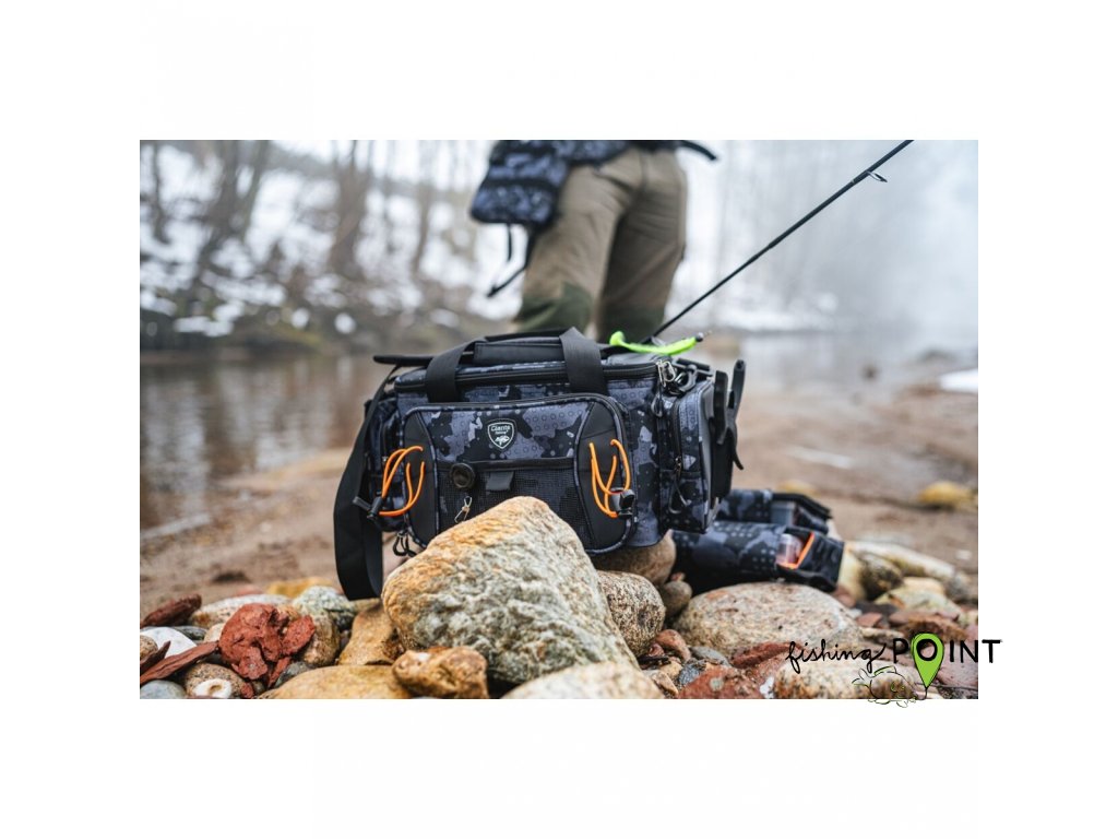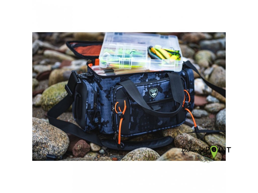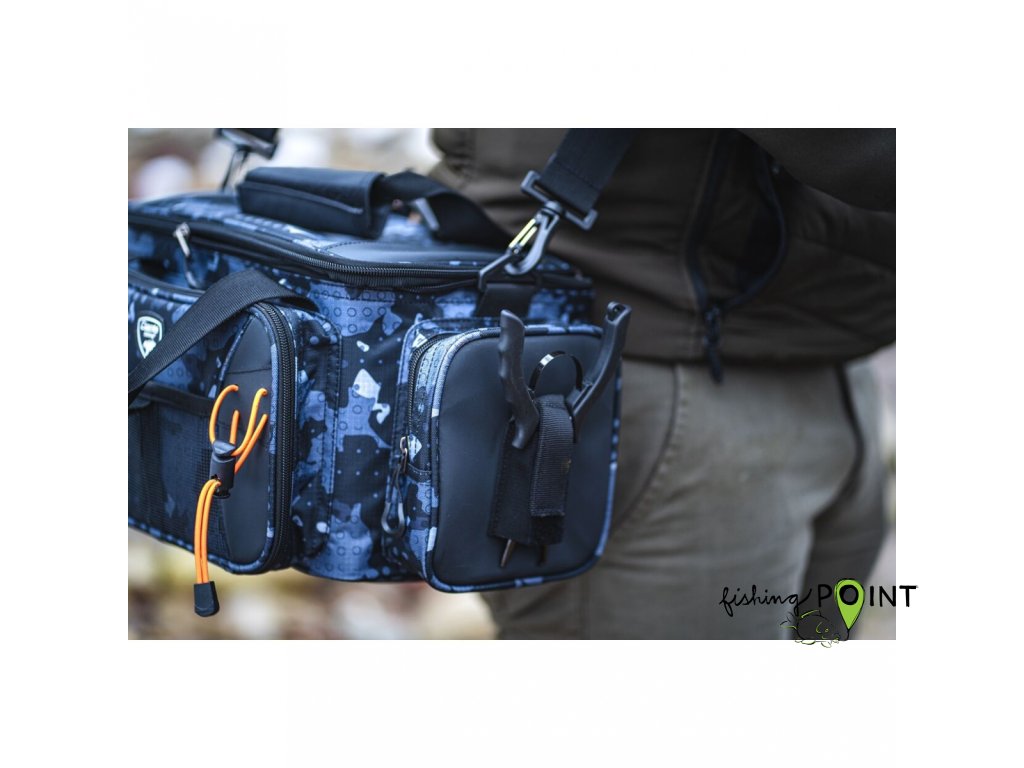 Větší vláčecí taška s popruhem přes rameno, která obsahuje čtyři větší krabičky na nástrahy.- Dlouhý ramenní popruh pro snadné přenášení