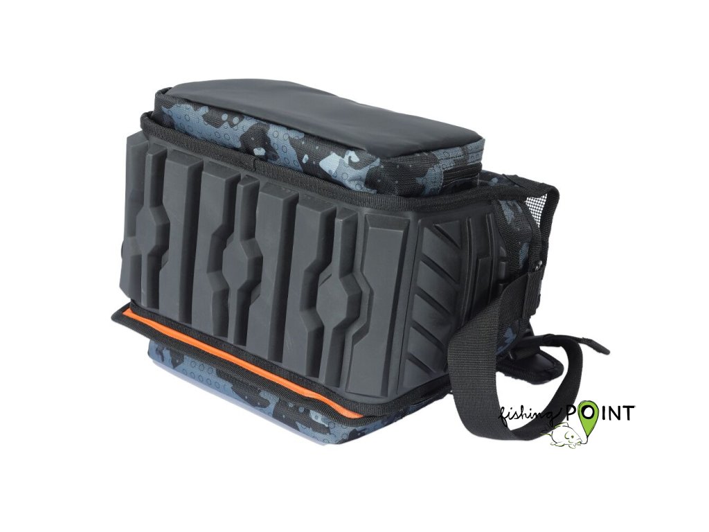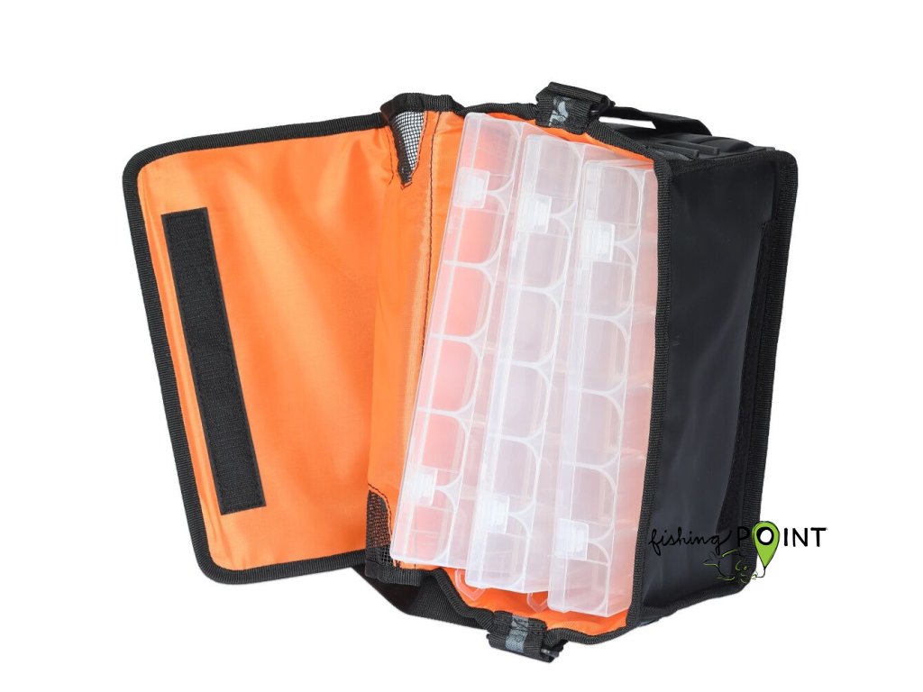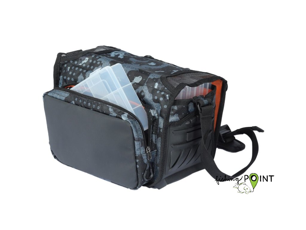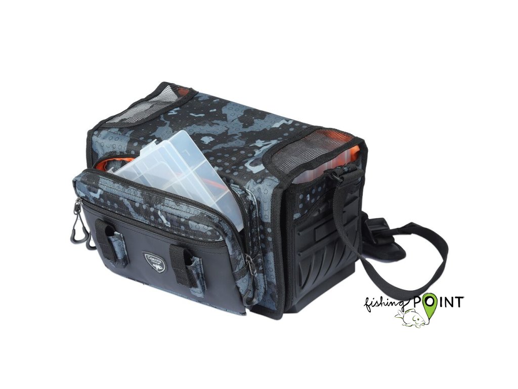Vláčecí taška střední velikosti, která obsahuje tři větší a dvě menší krabičky na nástrahy.- Kombinované madlo přes rameno má integrovaný měkčený úchyt