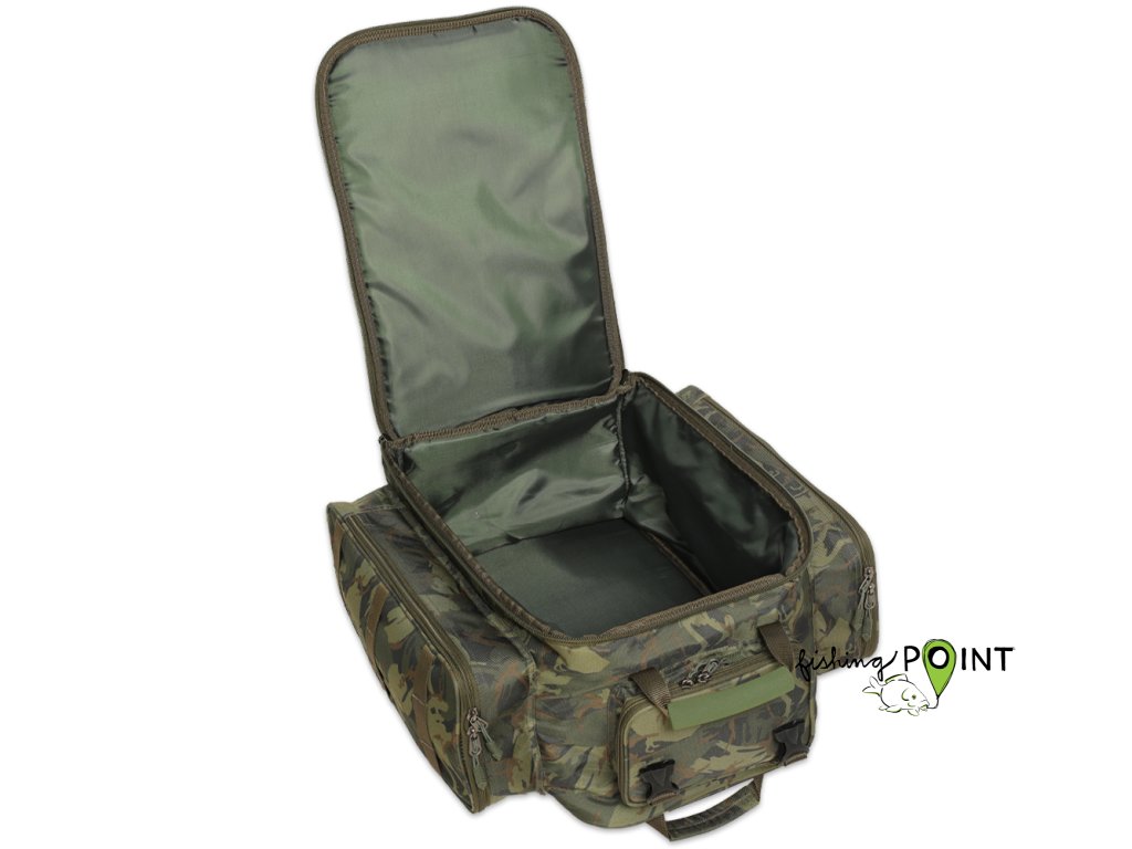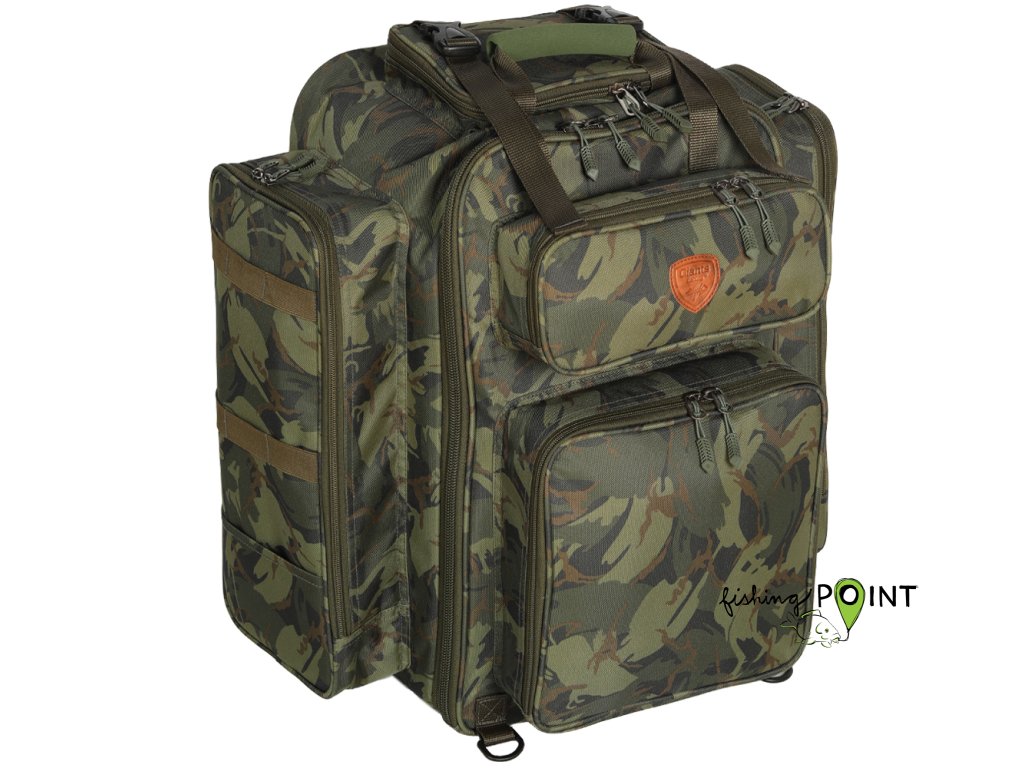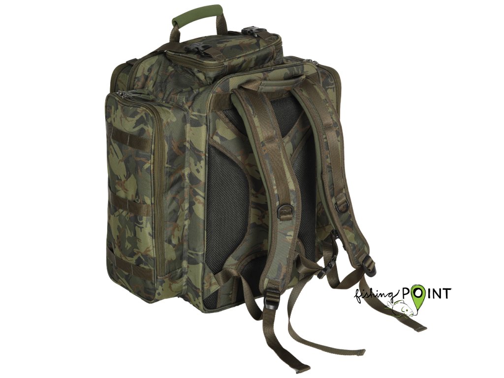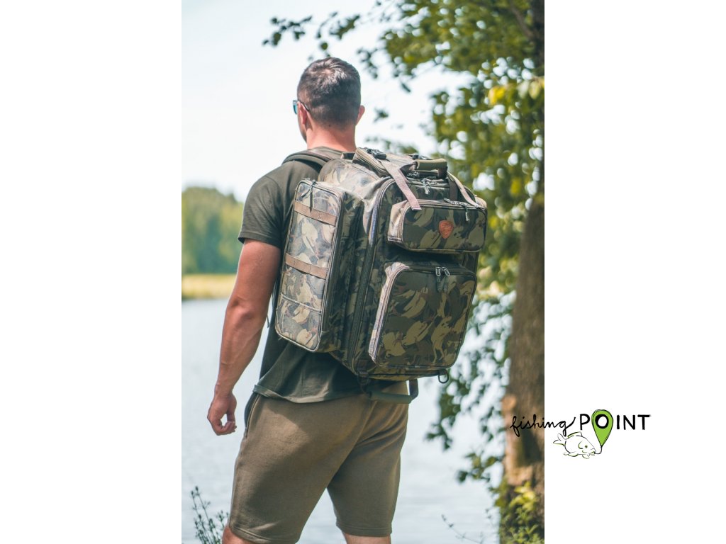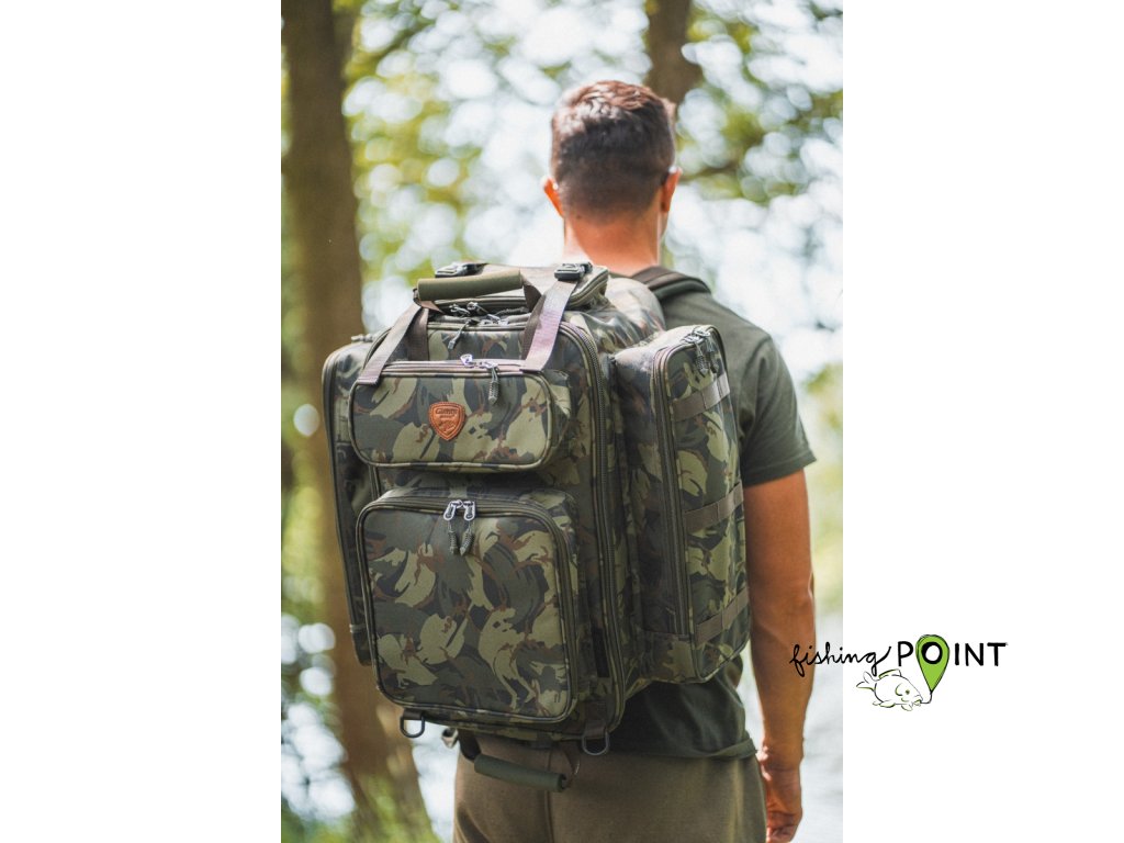 Celá přední část batohu výklopná a uzavíratelná na zip. Batoh má pět vnějších kapes po stranách. Plně polstrovaná zadní část pro pohodlné nošení, včetně komfortních ramenních popruhů. Měkčené EVA poutka pro snadnou a pohodlnou manipulaci. Boční poutka k uchycení podběráku, vidliček a vrchní k upevnění podložky. Vodě odolný materiál v kamuflážovém vzoru a spodní dno z omyvatelného materiálu. Rozměry: 55cm výška / 46cm šířka / hloubka 34cmDoplňkové parametry