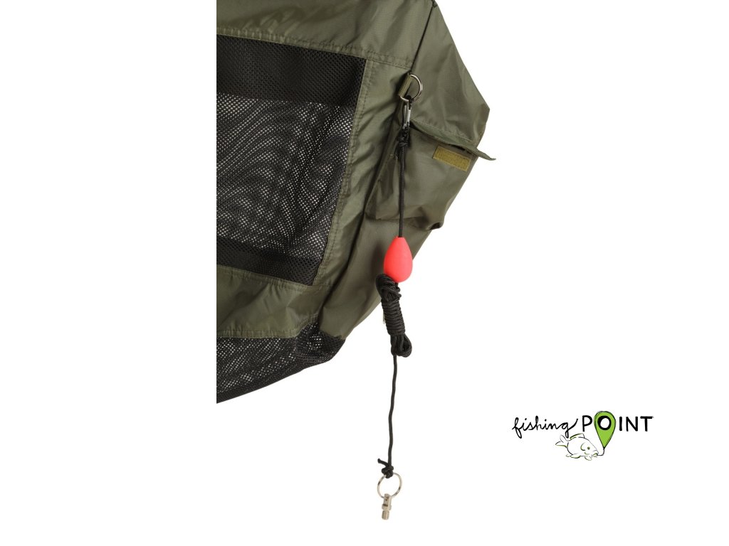 Extra velký a propracovaný vážící sak, ve kterém můžete bezpečně též přechovávat svůj úlovek.Vážící sak má plováky po celé délce, tím je zajištěno, že bezpečně nadnáší úlovek. Ve vrchní centrální části je dvojitý popruh, který je zakončen ocelovými kroužky a je určen k připojení váhy. Na koncích jsou čtyři madla, která mají neoprenové polstrování, pro snadnou a bezpečnou manipulaci s úlovkem.Dvojité zipy jsou po celé délce a ve vrchní části, je našita jistící karabinka, kterou zacvaknete do kovových jezdců a máte jistotu, že Vám úlovek neuplave. Velký důraz, byl kladen na síťové otvory, aby k úlovku proudil dostatek prokysličené vody. Z boku saku je kovové očko, na kterém je připevněno 3m lano, které je zakončeno plovákem s kovovým závitem k ukotvení na tyč. To vše je ukryto v kapsičce na suchý zip.